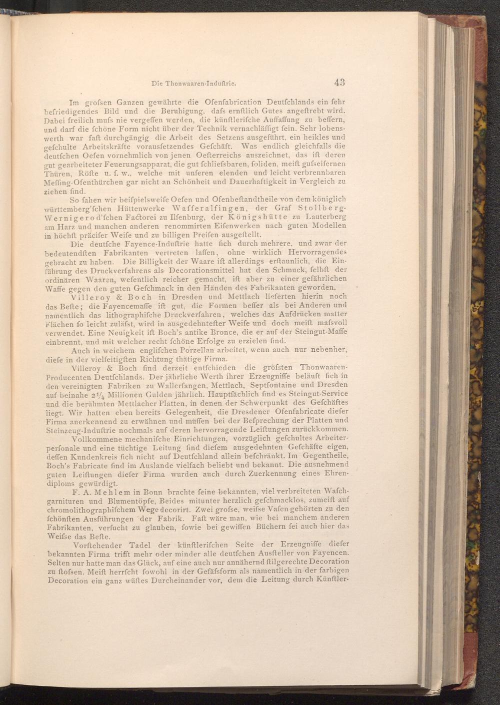 Villeroy& Boch find derzeit entfchieden die gröfsten ThonwaarenProducenten Deutfchlands. Der jährliche Werth ihrer Erzeugniffe beläuft sich in den vereinigten Fabriken zu Wallerfangen, Mettlach, Septfontaine und Dresden auf beinahe 21 Millionen Gulden jährlich. Hauptfächlich find es Steingut- Service und die berühmten Mettlacher Platten, in denen der Schwerpunkt des Gefchäftes liegt. Wir hatten eben bereits Gelegenheit, die Dresdener Ofenfabricate diefer Firma anerkennend zu erwähnen und müffen bei der Befprechung der Platten und Steinzeug- Induftrie nochmals auf deren hervorragende Leiftungen zurückkommen.