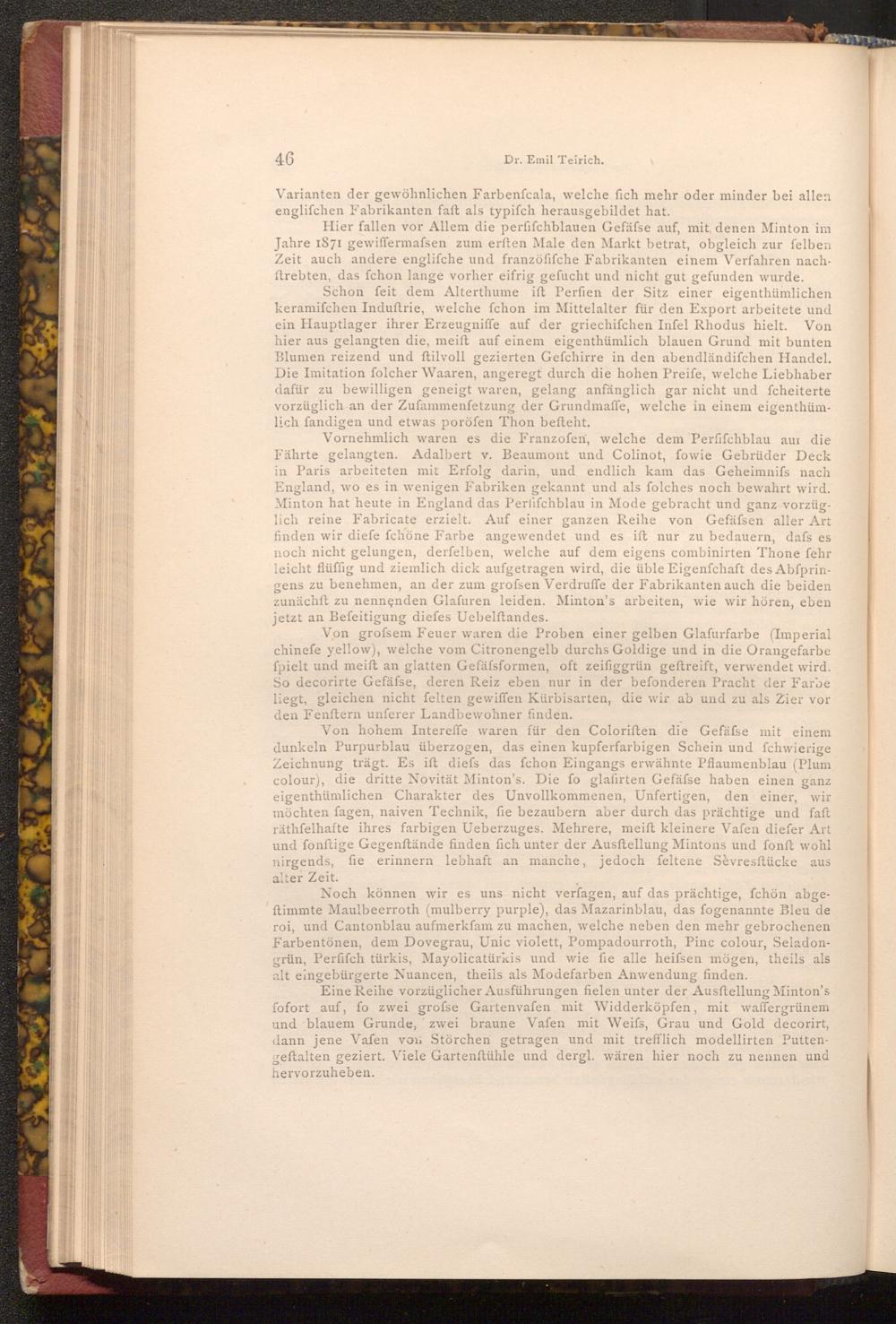 Vornehmlich waren es die Franzofen, welche dem Perfifchblau aur die Fährte gelangten. Adalbert v. Beaumont und Colinot, fowie Gebrüder Deck in Paris arbeiteten mit Erfolg darin, und endlich kam das Geheimnifs nach England, wo es in wenigen Fabriken gekannt und als folches noch bewahrt wird. Minton hat heute in England das Perfifchblau in Mode gebracht und ganz vorzüglich reine Fabricate erzielt. Auf einer ganzen Reihe von Gefäfsen aller Art finden wir diefe fchöne Farbe angewendet und es ift nur zu bedauern, dafs es noch nicht gelungen, derfelben, welche auf dem eigens combinirten Thone fehr leicht flüffig und ziemlich dick aufgetragen wird, die üble Eigenfchaft des Abfpringens zu benehmen, an der zum grofsen Verdruffe der Fabrikanten auch die beiden zunächft zu nennenden Glafuren leiden. Minton's arbeiten, wie wir hören, eben jetzt an Befeitigung diefes Uebelftandes.