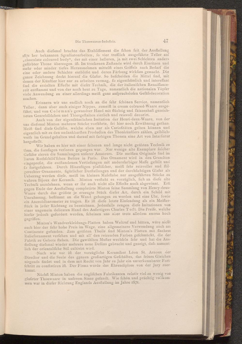 Nächft Minton haben die englifchen Fabrikanten relativ viel zu wenig von glafirter Thonwaare in unferem Sinne gefandt. Wie fchön und prächtig vollkom men war in diefer Richtung Englands Ausftellung im Jahre 1871.