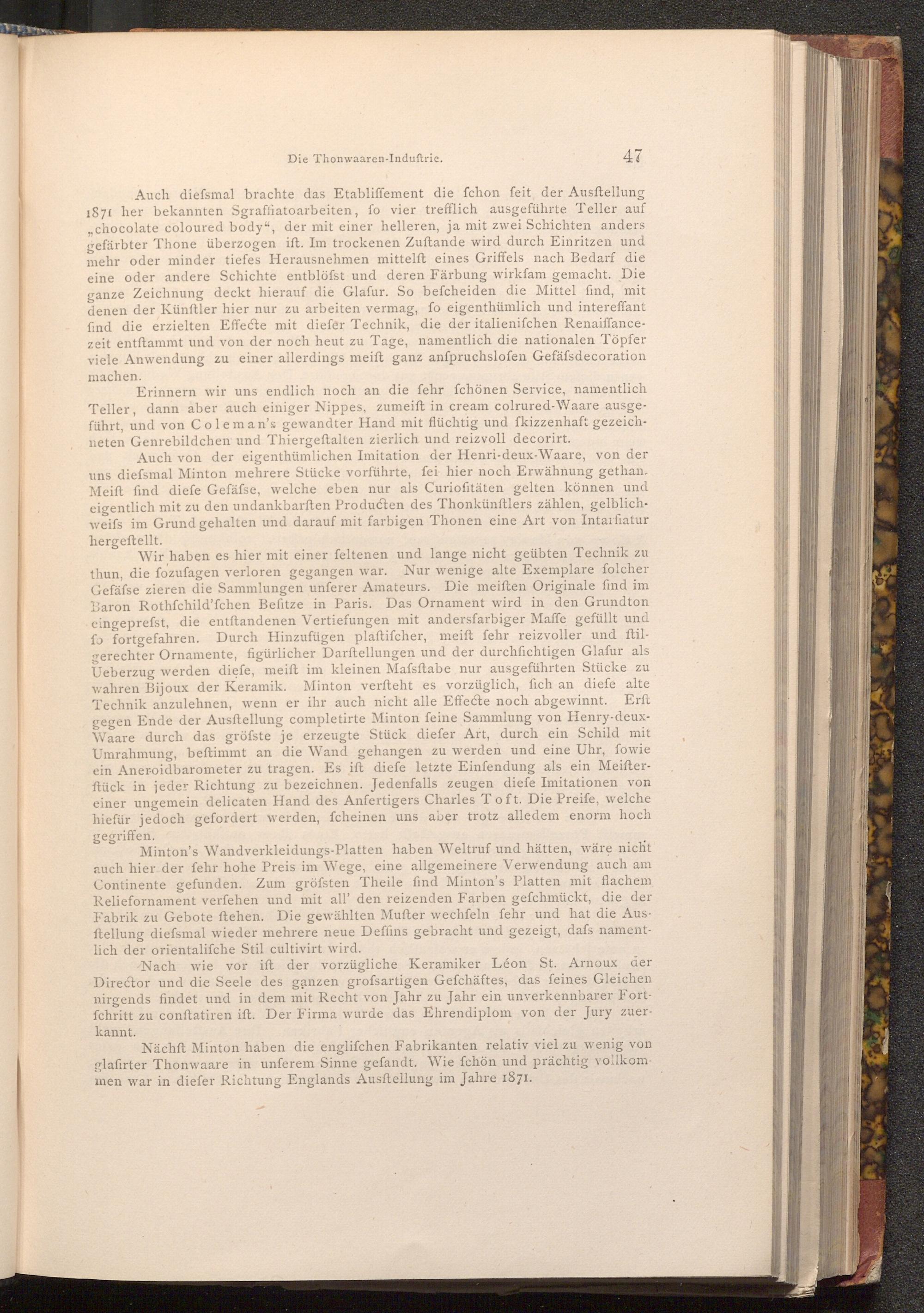 Auch von der eigenthümlichen Imitation der Henri- deux- Waare, von der uns diefsmal Minton mehrere Stücke vorführte, fei hier noch Erwähnung gethan. Meift find diefe Gefäfse, welche eben nur als Curiofitäten gelten können und eigentlich mit zu den undankbarften Producten des Thonkünftlers zählen, gelblichweifs im Grund gehalten und darauf mit farbigen Thonen eine Art von Intarfiatur hergeftellt.