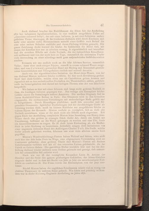 Nach wie vor ift der vorzügliche Keramiker Léon St. Arnoux der Director und die Seele des ganzen grofsartigen Gefchäftes, das feines Gleichen nirgends findet und in dem mit Recht von Jahr zu Jahr ein unverkennbarer Fortfchritt zu conftatiren ift. Der Firma wurde das Ehrendiplom von der Jury zuerkannt.