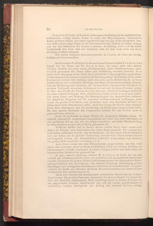 Deck ift perfönlich in feiner Fabrik als ausübender Künftler thätig. Er entwirft namentlich ornamentale Gegenftände und lehnt fich dabei faft immer an den perfifchen Stil an, der, wie wir fchon bemerkten, auf diefer Weltausstellung in allen Induftriezweigen faft in Mode gekommen ift.