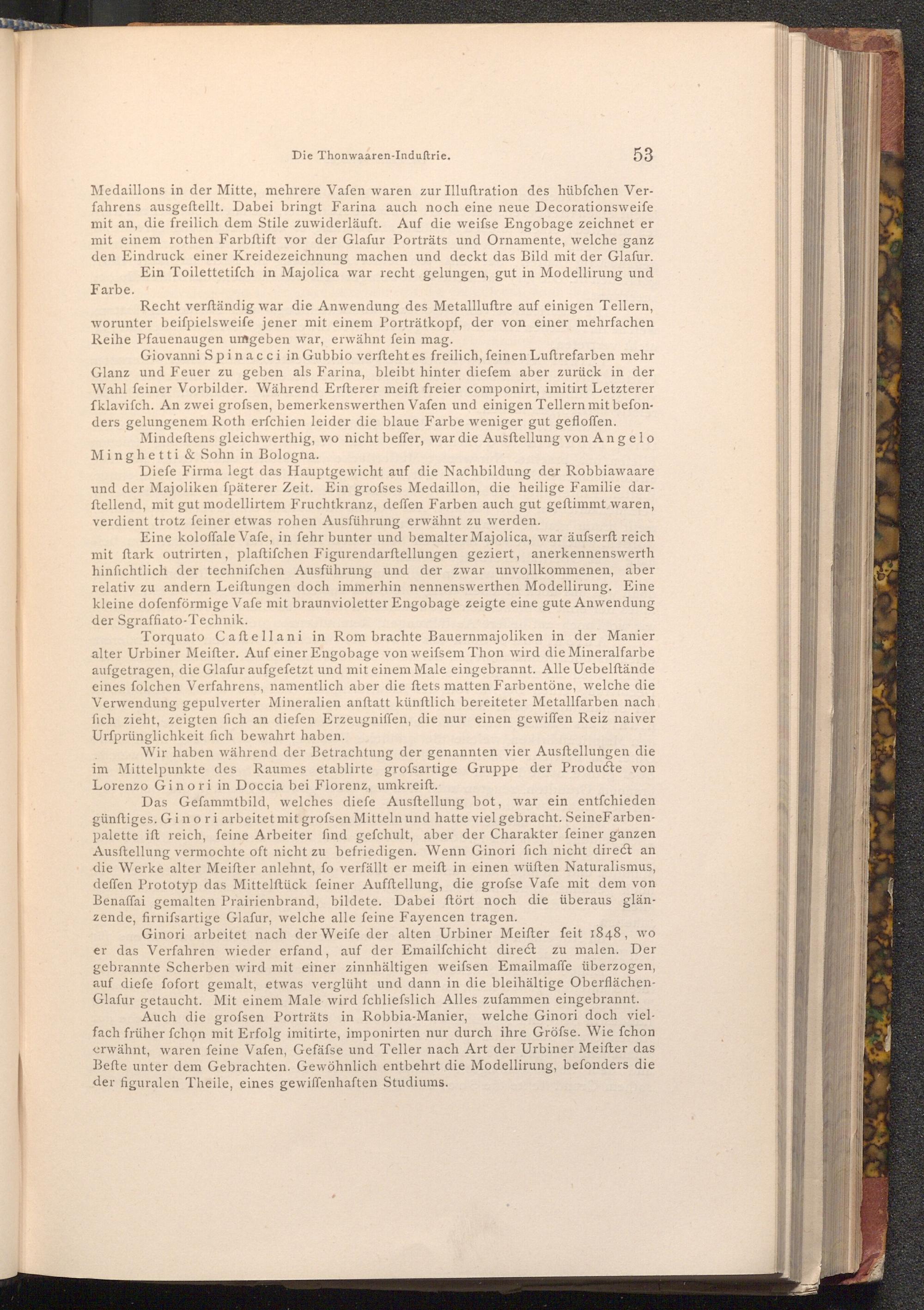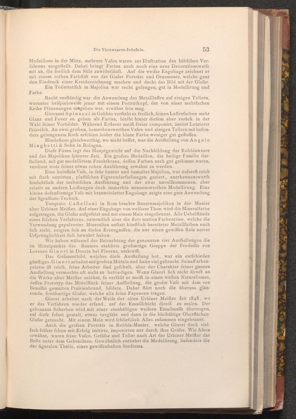 Giovanni Spinacci in Gubbio verfteht es freilich, feinen Luftrefarben mehr Glanz und Feuer zu geben als Farina, bleibt hinter diefem aber zurück in der Wahl feiner Vorbilder. Während Erfterer meift freier componirt, imitirt Letzterer fklavifch. An zwei grofsen, bemerkenswerthen Vafen und einigen Tellern mit befonders gelungenem Roth erſchien leider die blaue Farbe weniger gut gefloffen.