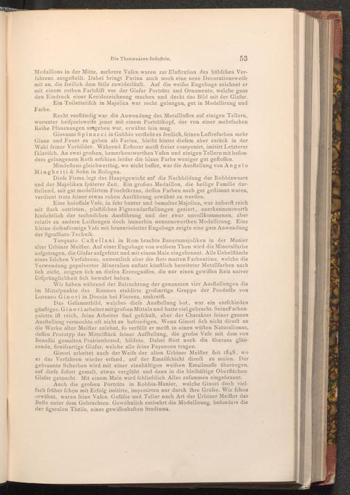 Auch die grofsen Porträts in Robbia- Manier, welche Ginori doch vielfach früher fchọn mit Erfolg imitirte, imponirten nur durch ihre Gröfse. Wie fchon erwähnt, waren feine Vafen, Gefäfse und Teller nach Art der Urbiner Meifter das Befte unter dem Gebrachten. Gewöhnlich entbehrt die Modellirung, befonders die der figuralen Theile, eines gewiffenhaften Studiums.