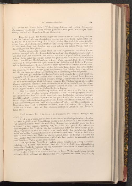 Pickmany Comp. in Sevilla ift die bedeutendefte Steingutfabrik des Landes, die nach englifchen und franzöfifchen Muftern mit heimifchen Kräften thunlichft viel zu leiften fcheint. Weift die Ausftellung Pickman's auch feit 1867 einen gewiffen Stillftand in der ganzen Richtung auf, fo fallen hier gewifs die befonderen Schwierigkeiten ins Gewicht, die das Fortarbeiten unter den obwaltenden politifchen Verhältniffen und bei einem eben auch nicht der induftriellen Arbeit befonders holden National charakter wohl wefentlich erklären. Ordinäre, bedruckte Service nach modernen Muftern, einige ziemlich rohe, landläufige Gefchirre mit einer matten Metalluftre- Decoration, endlich ein Paar grofser, im maurifchen Stile bunt decorirter Vafen mögen erwähnt fein.