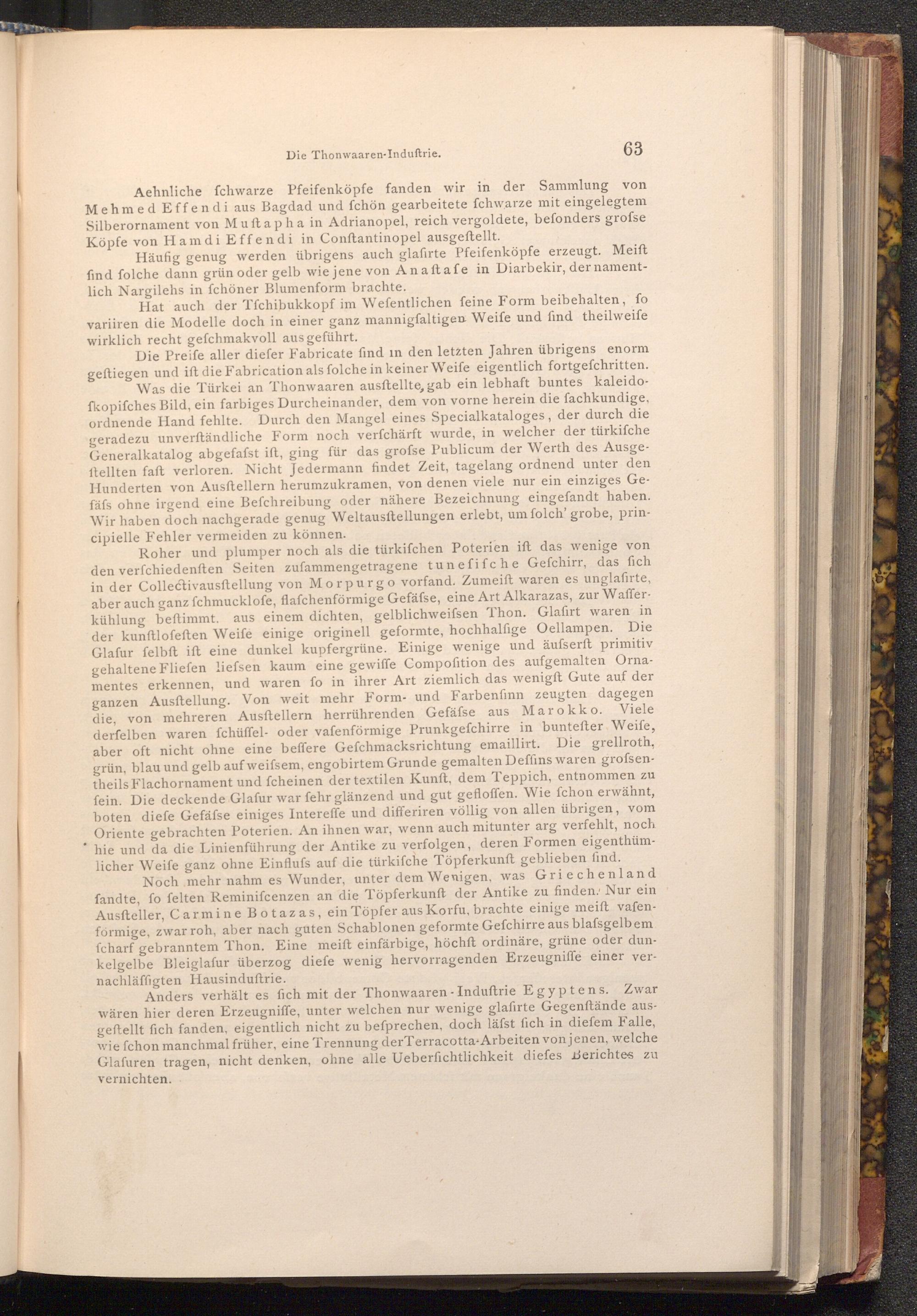Aehnliche fchwarze Pfeifenköpfe fanden wir in der Sammlung von Mehmed Effendi aus Bagdad und fchön gearbeitete fchwarze mit eingelegtem Silberornament von Mustapha in Adrianopel, reich vergoldete, befonders grofse Köpfe von Hamdi Effendi in Conftantinopel ausgeftellt.