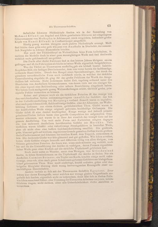 Anders verhält es fich mit der Thonwaaren- Induftrie Egyptens. Zwar wären hier deren Erzeugniffe, unter welchen nur wenige glafirte Gegenftände ausgeftellt fich fanden, eigentlich nicht zu befprechen, doch läfst fich in diefem Falle, wie fchon manchmal früher, eine Trennung der Terracotta- Arbeiten von jenen, welche Glafuren tragen, nicht denken, ohne alle Ueberfichtlichkeit diefes Berichtes zu
