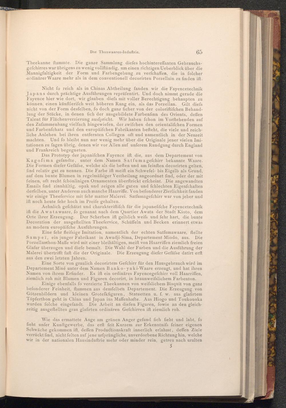 Eine fehr fleifsige Imitation, namentlich der echten Satfumawaare, ftellte Sampeï, ein junger Fabrikant in Awadji- Sima, Departement Miodo, aus. Die Porzellanthon- Maffe wird mit einer bleihältigen, meift von Haarriffen ziemlich freien Glafur überzogen und diefe bemalt. Die Wahl der Farben und die Ausführung der Malerei übertrifft faft die der Originale. Die Erzeugung diefer Gefäfse datirt erft aus den zwei letzten Jahren.