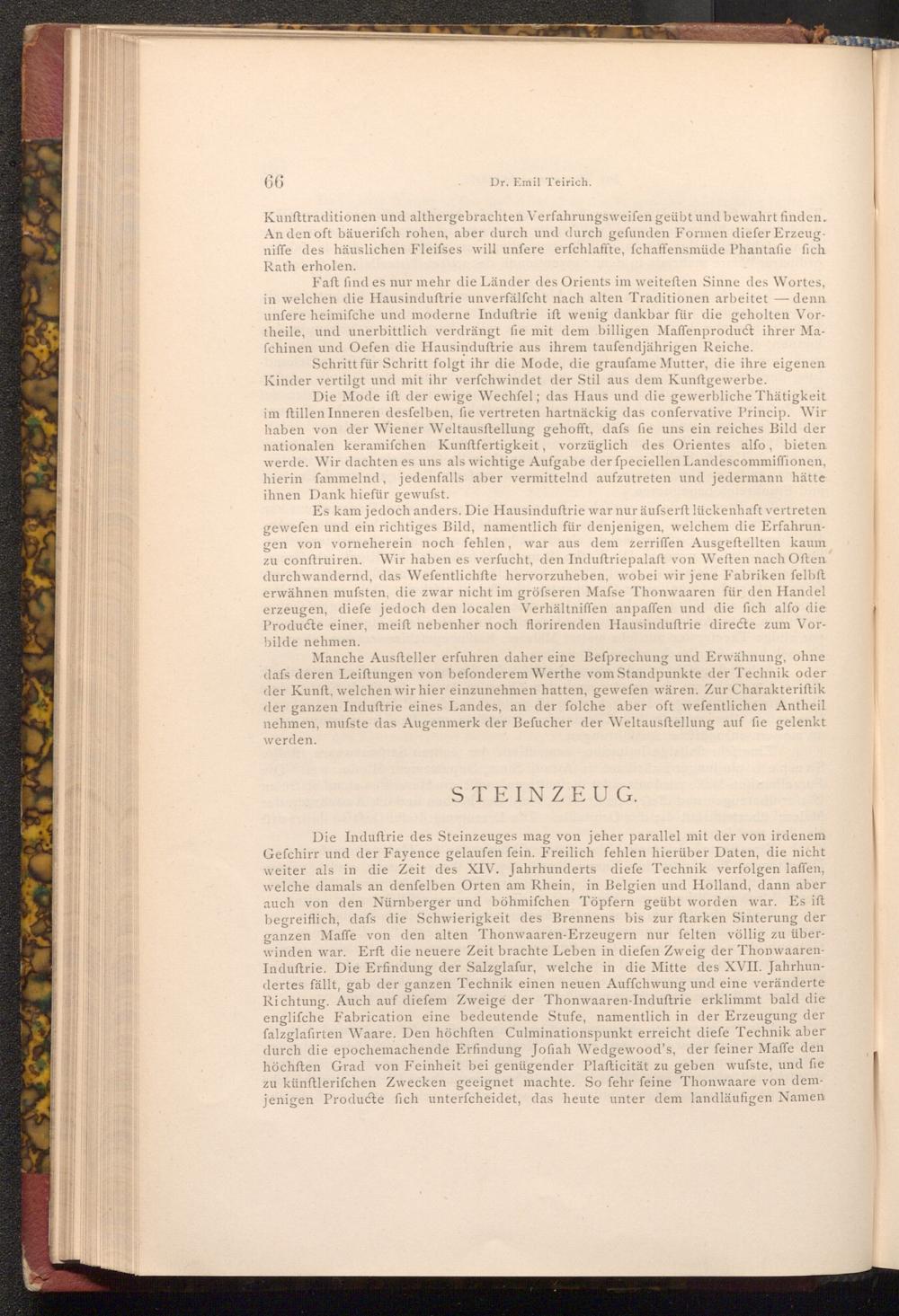 Die Induftrie des Steinzeuges mag von jeher parallel mit der von irdenem Gefchirr und der Fayence gelaufen fein. Freilich fehlen hierüber Daten, die nicht weiter als in die Zeit des XIV. Jahrhunderts diefe Technik verfolgen laffen, welche damals an denfelben Orten am Rhein, in Belgien und Holland, dann aber auch von den Nürnberger und böhmifchen Töpfern geübt worden war. Es iſt begreiflich, dafs die Schwierigkeit des Brennens bis zur ſtarken Sinterung der ganzen Maffe von den alten Thonwaaren- Erzeugern nur felten völlig zu überwinden war. Erft die neuere Zeit brachte Leben in diefen Zweig der ThonwaarenInduftrie. Die Erfindung der Salzglafur, welche in die Mitte des XVII. Jahrhundertes fällt, gab der ganzen Technik einen neuen Auffchwung und eine veränderte Richtung. Auch auf diefem Zweige der Thonwaaren- Induftrie erklimmt bald die englifche Fabrication eine bedeutende Stufe, namentlich in der Erzeugung der falzglafirten Waare. Den höchften Culminationspunkt erreicht diefe Technik aber durch die epochemachende Erfindung Jofiah Wedgewood's, der feiner Maffe den höchften Grad von Feinheit bei genügender Plafticität zu geben wufste, und fie zu künftlerifchen Zwecken geeignet machte. So fehr feine Thonwaare von demjenigen Producte fich unterfcheidet, das heute unter dem landläufigen Namen