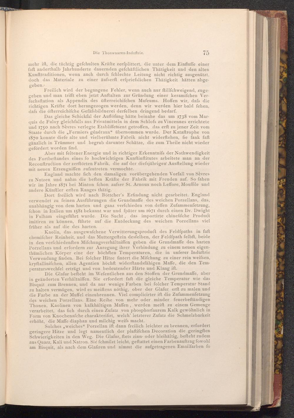 Das gleiche Schickfal der Auflöſung hätte beinahe das um 1738 vom Marquis de Fuloy gleichfalls aus Privatmitteln in dem Schlofs zu Vincennes errichtete und 1750 nach Sèvres verlegte Etabliffement getroffen, das erft zu jener Zeit vom Staate durch die Fermiers généraux" übernommen wurde. Der Kataftrophe von 1870 konnte diefe alte und vielberühmte Fabrik nicht widerftehen, fie fank faft gänzlich in Trümmer und begrub darunter Schätze, die zum Theile nicht wieder gefördert worden find.
