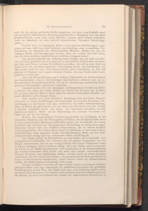 Dort freilich wird nach Böttcher's Erfindung nicht gearbeitet. England verwendet zu feinen Ausführungen die Grundmaffe des weichen Porzellans, das, unabhängig von dem harten und ganz verfchieden von deffen Zufammenfetzung, fchon in Italien um 1581 bekannt war und fpäter um 1671 durch einen Dr. Dwight in Fulham eingeführt wurde. Die Sucht, das importirte chinefifche Product imitiren zu können, führte auf die Entdeckung des weichen Porzellans viel früher als auf die des harten.