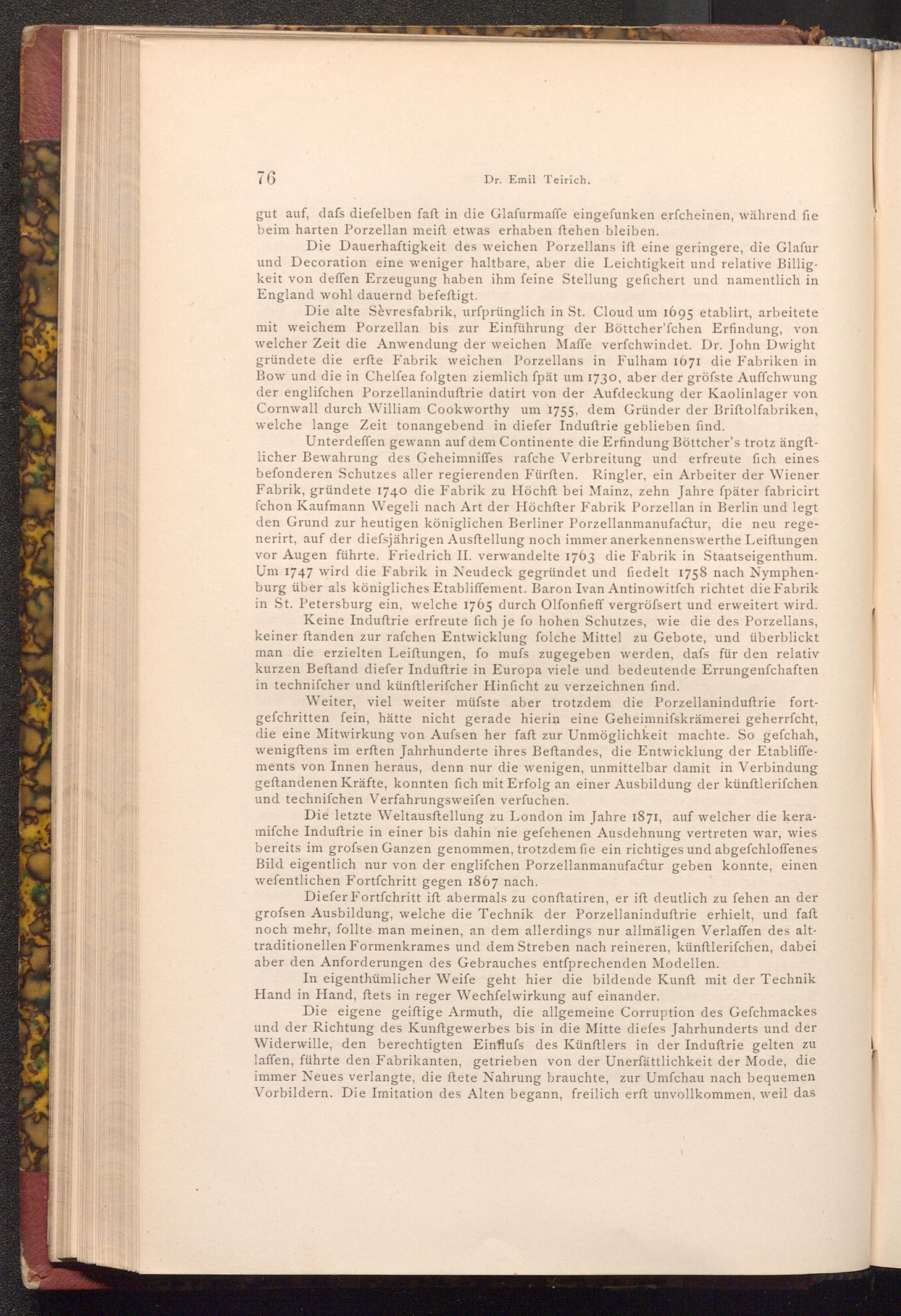 Die alte Sèvresfabrik, urfprünglich in St. Cloud um 1695 etablirt, arbeitete mit weichem Porzellan bis zur Einführung der Böttcher'fchen Erfindung, von welcher Zeit die Anwendung der weichen Maffe verfchwindet. Dr. John Dwight gründete die erfte Fabrik weichen Porzellans in Fulham 1671 die Fabriken in Bow und die in Chelſea folgten ziemlich fpät um 1730, aber der gröfste Auffchwung der englifchen Porzellaninduftrie datirt von der Aufdeckung der Kaolinlager von Cornwall durch William Cookworthy um 1755, dem Gründer der Briftolfabriken, welche lange Zeit tonangebend in diefer Induftrie geblieben find.