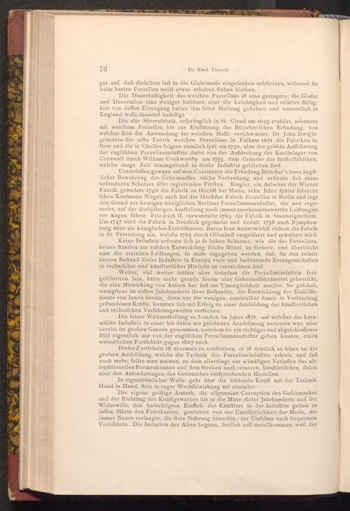 Die Dauerhaftigkeit des weichen Porzellans ift eine geringere, die Glafur und Decoration eine weniger haltbare, aber die Leichtigkeit und relative Billigkeit von deffen Erzeugung haben ihm feine Stellung gefichert und namentlich in England wohl dauernd befeftigt.
