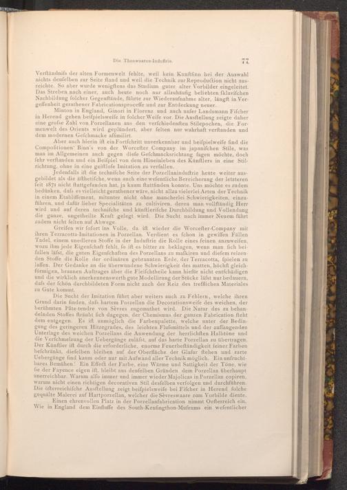 Jedenfalls ift die techniſche Seite der Porzellaninduftrie heute weiter ausgebildet als die äfthetifche, wenn auch eine wefentliche Bereicherung der letzteren feit 1871 nicht ftattgefunden hat, ja kaum ftattfinden konnte. Uns möchte es zudem bedünken, dafs es vielleicht gerathener wäre, nicht allzu vielerlei Arten der Technik in einem Etabliffement, mitunter nicht ohne mancherlei Schwierigkeiten, einzuführen, und dafür lieber Specialitäten zu cultiviren, deren man vollſtändig Herr wird und auf deren technifche und künftlerifche Durchbildung und Vollendung die ganze, ungetheilte Kraft gelegt wird. Die Sucht nach immer Neuem führt zudem nicht felten auf Abwege.