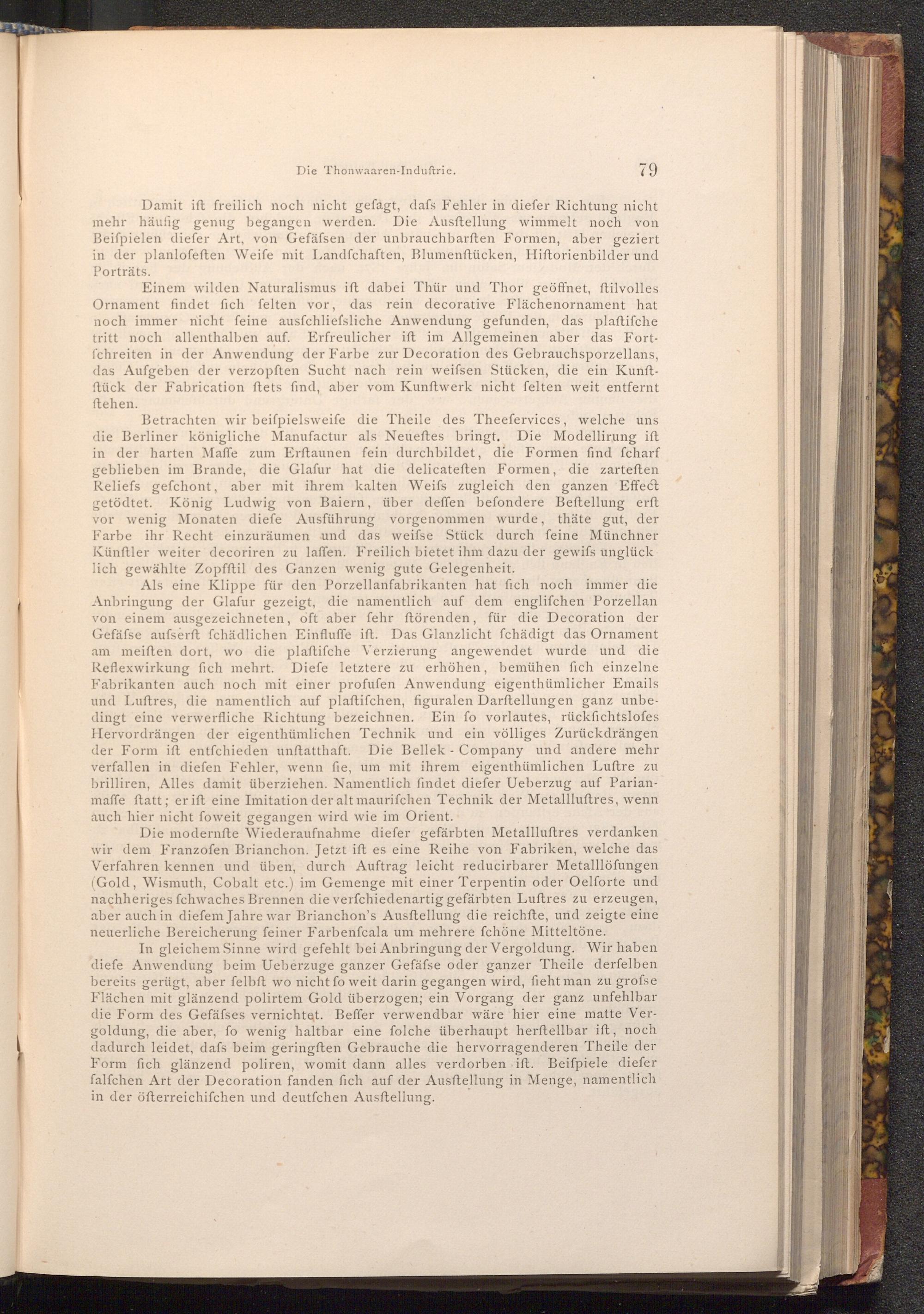 Die modernfte Wiederaufnahme diefer gefärbten Metallluftres verdanken wir dem Franzofen Brianchon. Jetzt ift es eine Reihe von Fabriken, welche das Verfahren kennen und üben, durch Auftrag leicht reducirbarer Metalllöfungen ( Gold, Wismuth, Cobalt etc.) im Gemenge mit einer Terpentin oder Oelforte und nachheriges fchwaches Brennen die verfchiedenartig gefärbten Luftres zu erzeugen, aber auch in diefem Jahre war Brianchon's Ausftellung die reichfte, und zeigte eine neuerliche Bereicherung feiner Farbenfcala um mehrere fchöne Mitteltöne.
