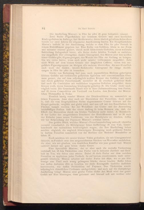 Noch möchten wir zweier kleiner Vafen gedenken, die mit Limogemalerei decorirt, an Feinheit zwar den ausgezeichneten Stücken von Worceſter nachftehen, die aber, wie wir glauben, von demfelben Künftler wie jene gemalt find. Minton cultivirt derzeit nur ganz felten diefes Genre.