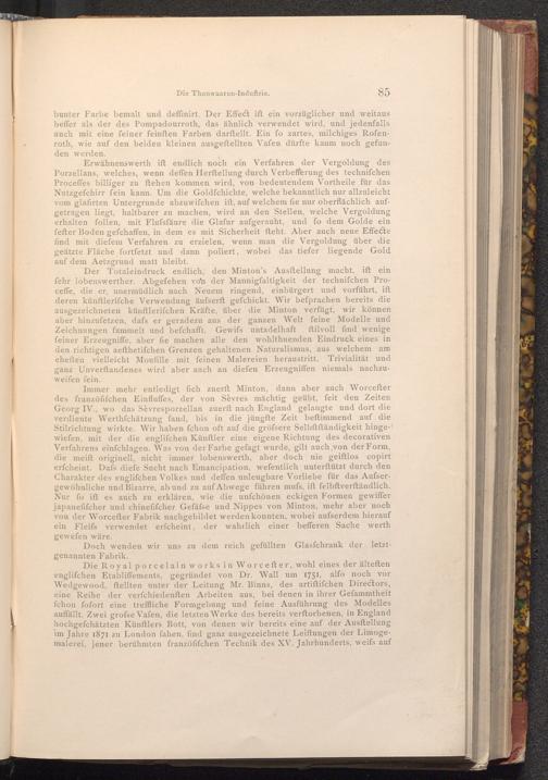 Die Royal porcelain works in Worceſter, wohl eines der älteften englifchen Etabliffements, gegründet von Dr. Wall um 1751, alfo noch vor Wedgewood, ftellten unter der Leitung Mr. Binns, des artiftifchen Directors, eine Reihe der verfchiedenften Arbeiten aus, bei denen in ihrer Gefammtheit fchon fofort eine treffliche Formgebung und feine Ausführung des Modelles auffällt. Zwei grofse Vafen, die letzten Werke des bereits verftorbenen, in England hochgefchätzten Künftlers Bott, von denen wir bereits eine auf der Ausftellung im Jahre 1871 zu London fahen, find ganz ausgezeichnete Leiftungen der Limogemalerei, jener berühmten franzöfifchen Technik des XV. Jahrhunderts, weifs auf