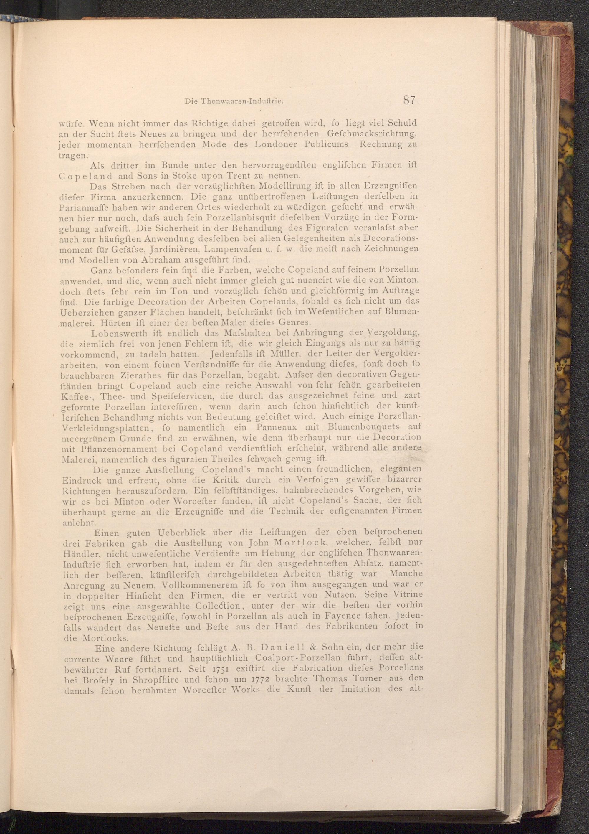 Eine andere Richtung fchlägt A. B. Daniell& Sohn ein, der mehr die currente Waare führt und hauptfächlich Coalport- Porzellan führt, deffen altbewährter Ruf fortdauert. Seit 1751 exiftirt die Fabrication diefes Porcellans. bei Brofely in Shropſhire und fchon um 1772 brachte Thomas Turner aus den damals fchon berühmten Worcefter Works die Kunft der Imitation des alt