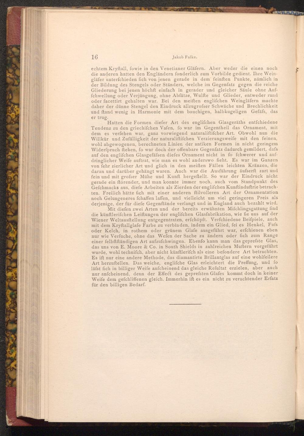 Hatten die Formen diefer Art des englifchen Glasgeräths entfchiedene Tendenz zu den griechifchen Vafen, fo war im Gegentheil das Ornament, mit dem es verfehen war, ganz vorwiegend naturaliftifcher Art. Obwohl nun die Willkür und Zufälligkeit der naturaliftifchen Verzierungsweife mit den feinen, wohl abgewogenen, berechneten Linien der antiken Formen in nicht geringem Widerfpruch ftehen, fo war doch der offenbare Gegenfatz dadurch gemildert, dafs auf den englifchen Glasgefäfsen diefes Ornament nicht in fo fchwerer und aufdringlicher Weife auftrat, wie man es wohl anderswo fieht. Es war im Ganzen von fehr zierlicher Art und glich in den meiſten Fällen leichten Kränzen, die daran und darüber gehängt waren. Auch war die Ausführung äufserft zart und fein und mit grofser Mühe und Kunft hergeftellt. So war der Eindruck nicht gerade ein ftörender, und man konnte immer noch, auch vom Standpunkt des Gefchmacks aus, diefe Arbeiten als Zierden der englifchen Kunftinduftrie betrachten. Freilich hätte fich mit einer anderen ftilvolleren Art der Ornamentation noch Gelungeneres fchaffen laffen, und vielleicht um viel geringeren Preis als derjenige, der für diefe Gegenftände verlangt und in England auch bezahlt wird. Mit diefen zwei Arten und der bereits erwähnten Mifchlingsgattung find die künftlerifchen Leiftungen der englifchen Glasfabrikation, wie fie uns auf der Wiener Weltausftellung entgegentraten, erfchöpft. Verfchiedene Beiſpiele, auch mit dem Kryftallglafe Farbe zu verbinden, indem ein Glied, fei es Henkel, Fufs oder Kelch, in rothem oder grünem Glafe ausgeführt war, erfchienen eben nur wie Verfuche, ohne das Wefen der Sache zu ändern oder fich zum Range einer felbftftändigen Art aufzufchwingen. Ebenfo kann man das geprefste Glas, das uns von E. Moore& Co. in South Shields in zahlreichen Muftern vorgeführt wurde, wohl technifch, aber nicht künftlerifch als eine befondere Art betrachten. Es ist nur eine andere Methode, das diamantirte Brillantglas auf eine wohlfeilere Art herzuftellen. Das weiche, englifche Glas erleichtert die Preffung, und fo läfst fich in billiger Weife anfcheinend das gleiche Reſultat erzielen, aber auch nur anfcheinend, denn der Effect des geprefsten Glafes kommt doch in keiner Weife dem gefchliffenen gleich. Immerhin ift es ein nicht zu verachtender Erfatz für den billigen Bedarf.