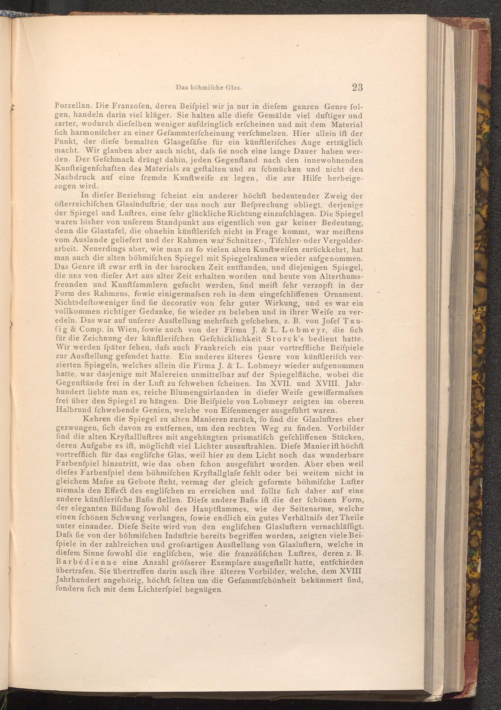 Kehren die Spiegel zu alten Manieren zurück, fo find die Glasluftres eher gezwungen, fich davon zu entfernen, um den rechten Weg zu finden. Vorbilder find die alten Kryftallluftres mit angehängten prismatifch gefchliffenen Stücken, deren Aufgabe es ift, möglichst viel Lichter auszuftrahlen. Diefe Manier ift höchft vortrefflich für das englifche Glas, weil hier zu dem Licht noch das wunderbare Farbenfpiel hinzutritt, wie das oben fchon ausgeführt worden. Aber eben weil diefes Farbenfpiel dem böhmifchen Kryftallglafe fehlt oder bei weitem nicht in gleichem Mafse zu Gebote fteht, vermag der gleich geformte böhmifche Lufter niemals den Effect des englifchen zu erreichen und follte fich daher auf eine andere künftlerifche Bafis ftellen. Diefe andere Bafis ift die der fchönen Form, der eleganten Bildung fowohl des Hauptftammes, wie der Seitenarme, welche einen fchönen Schwung verlangen, fowie endlich ein gutes Verhältnifs der Theile unter einander. Diefe Seite wird von den englifchen Glasluftern vernachläffigt. Dafs fie von der böhmifchen Induftrie bereits begriffen worden, zeigten viele Beiſpiele in der zahlreichen und grofsartigen Ausftellung von Glasluftern, welche in diefem Sinne fowohl die englifchen, wie die franzöfifchen Luftres, deren z. B. Barbédienne eine Anzahl gröfserer Exemplare ausgeftellt hatte, entfchieden übertrafen. Sie übertreffen darin auch ihre älteren Vorbilder, welche, dem XVIII Jahrhundert angehörig, höchft felten um die Gefammtfchönheit bekümmert find, fondern fich mit dem Lichterfpiel begnügen.
