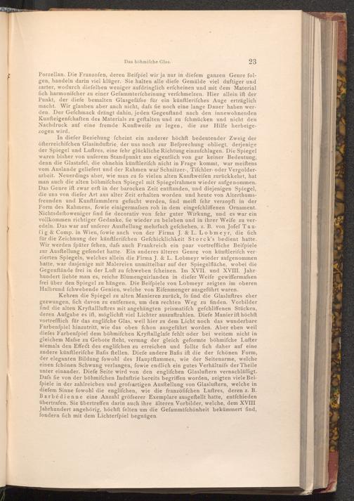 In diefer Beziehung fcheint ein anderer höchft bedeutender Zweig der öfterreichifchen Glasinduftrie, der uns noch zur Befprechung obliegt, derjenige der Spiegel und Luftres, eine fehr glückliche Richtung einzufchlagen. Die Spiegel waren bisher von unferem Standpunkt aus eigentlich von gar keiner Bedeutung, denn die Glastafel, die ohnehin künftlerifch nicht in Frage kommt, war meiftens vom Auslande geliefert und der Rahmen war Schnitzer-, Tifchler- oder Vergolderarbeit. Neuerdings aber, wie man zu fo vielen alten Kunftweifen zurückkehrt, hat man auch die alten böhmifchen Spiegel mit Spiegelrahmen wieder aufgenommen. Das Genre ift zwar erft in der barocken Zeit entftanden, und diejenigen Spiegel, die uns von diefer Art aus alter Zeit erhalten worden und heute von Alterthumsfreunden und Kunftfammlern gefucht werden, find meift fehr verzopft in der Form des Rahmens, fowie einigermassen roh in dem eingefchliffenen Ornament. Nichtsdeftoweniger find fie decorativ von fehr guter Wirkung, und es war ein vollkommen richtiger Gedanke, fie wieder zu beleben und in ihrer Weife zu veredeln. Das war auf unferer Ausftellung mehrfach gefchehen, z. B. von Jofef Taufig& Comp. in Wien, fowie auch von der Firma J.& L. Lobmeyr, die fich für die Zeichnung der künftlerifchen Gefchicklichkeit Storck's bedient hatte. Wir werden fpäter fehen, dafs auch Frankreich ein paar vortreffliche Beiſpiele zur Ausftellung gefendet hatte. Ein anderes älteres Genre von künftlerifch verzierten Spiegeln, welches allein die Firma J.& L. Lobmeyr wieder aufgenommen hatte, war dasjenige mit Malereien unmittelbar auf der Spiegelfläche, wobei die Gegenftände frei in der Luft zu fchweben fcheinen. Im XVII. und XVIII. Jahrhundert liebte man es, reiche Blumenguirlanden in diefer Weife gewiffermafsen frei über den Spiegel zu hängen. Die Beiſpiele von Lobmeyr zeigten im oberen Halbrund fchwebende Genien, welche von Eifenmenger ausgeführt waren.