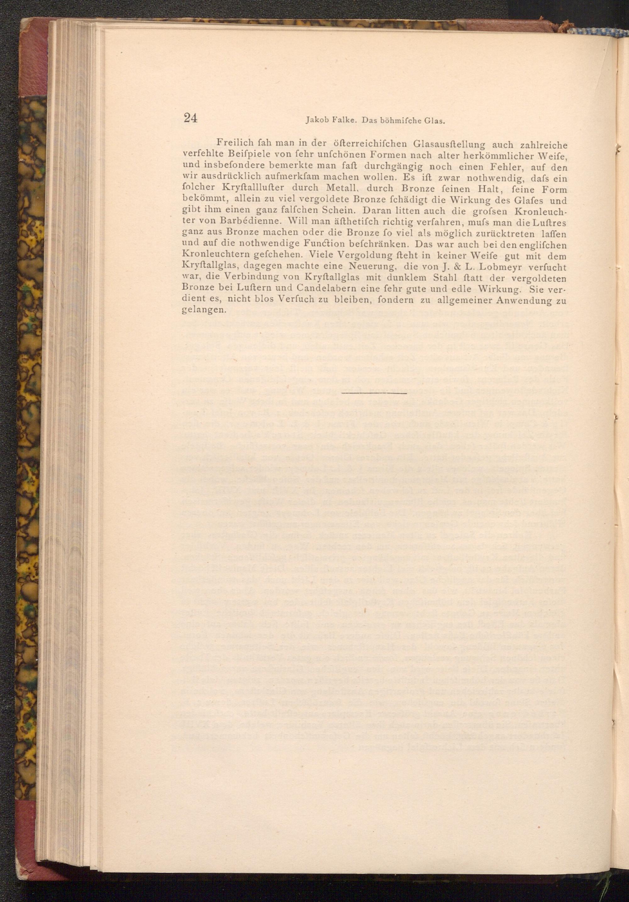 Freilich fah man in der öfterreichifchen Glasausftellung auch zahlreiche verfehlte Beiſpiele von fehr unfchönen Formen nach alter herkömmlicher Weife, und insbefondere bemerkte man faft durchgängig noch einen Fehler, auf den wir ausdrücklich aufmerkfam machen wollen. Es ift zwar nothwendig, dafs ein folcher Kryftalllufter durch Metall, durch Bronze feinen Halt, feine Form bekömmt, allein zu viel vergoldete Bronze fchädigt die Wirkung des Glafes und gibt ihm einen ganz falfchen Schein. Daran litten auch die grofsen Kronleuchter von Barbédienne. Will man äfthetiſch richtig verfahren, mufs man die Luftres ganz aus Bronze machen oder die Bronze fo viel als möglich zurücktreten laffen und auf die nothwendige Function befchränken. Das war auch bei den englifchen Kronleuchtern gefchehen. Viele Vergoldung fteht in keiner Weife gut mit dem Kryftallglas, dagegen machte eine Neuerung, die von J.& L. Lobmeyr verfucht war, die Verbindung von Kryftallglas mit dunklem Stahl ftatt der vergoldeten Bronze bei Luftern und Candelabern eine fehr gute und edle Wirkung. Sie verdient es, nicht blos Verfuch zu bleiben, fondern zu allgemeiner Anwendung zu gelangen.
