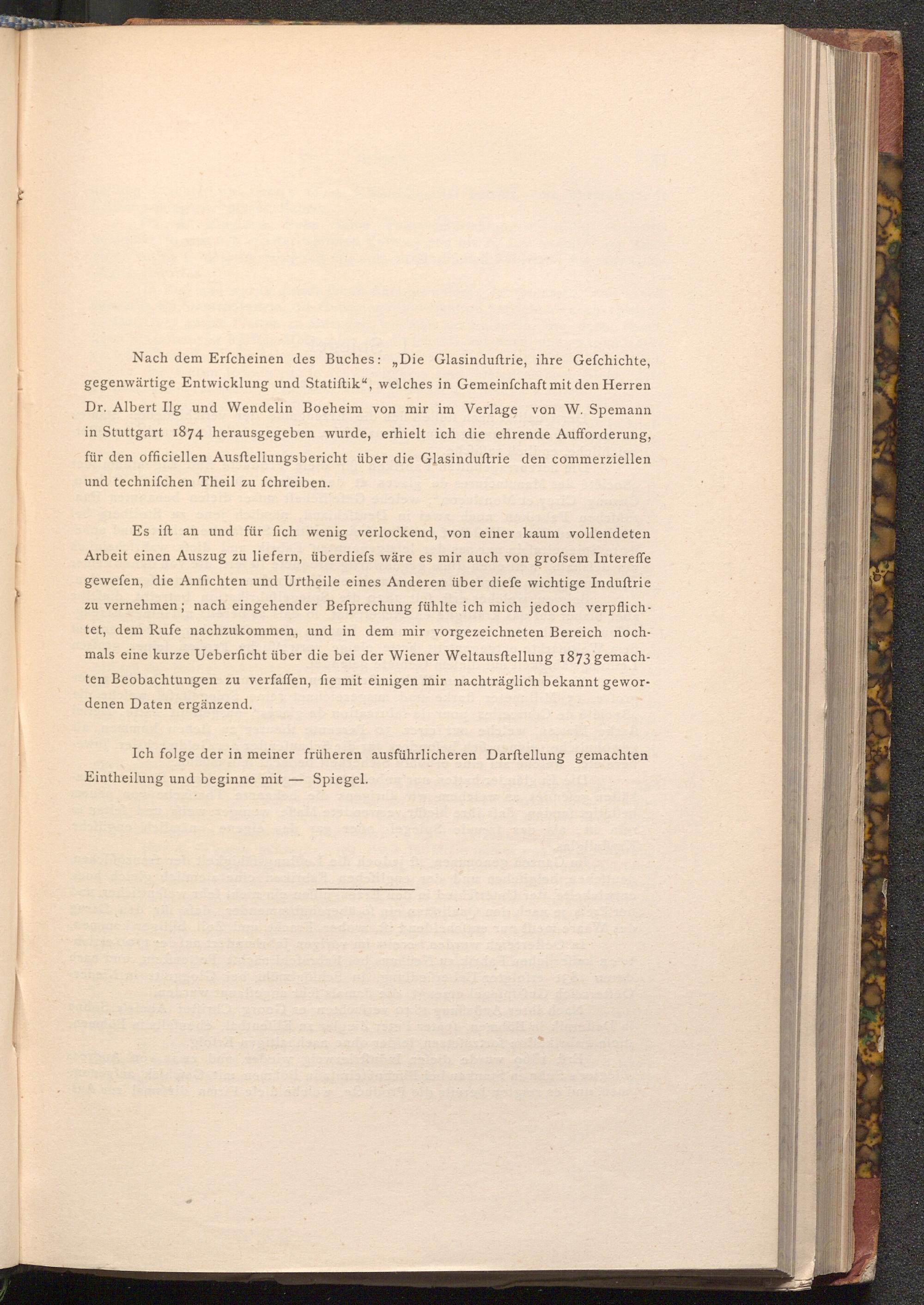 Nach dem Erfcheinen des Buches:„ Die Glasinduftrie, ihre Gefchichte, gegenwärtige Entwicklung und Statiftik", welches in Gemeinfchaft mit den Herren Dr. Albert Ilg und Wendelin Boeheim von mir im Verlage von W. Spemann in Stuttgart 1874 herausgegeben wurde, erhielt ich die ehrende Aufforderung, für den officiellen Ausftellungsbericht über die Glasinduftrie den commerziellen und technifchen Theil zu fchreiben.