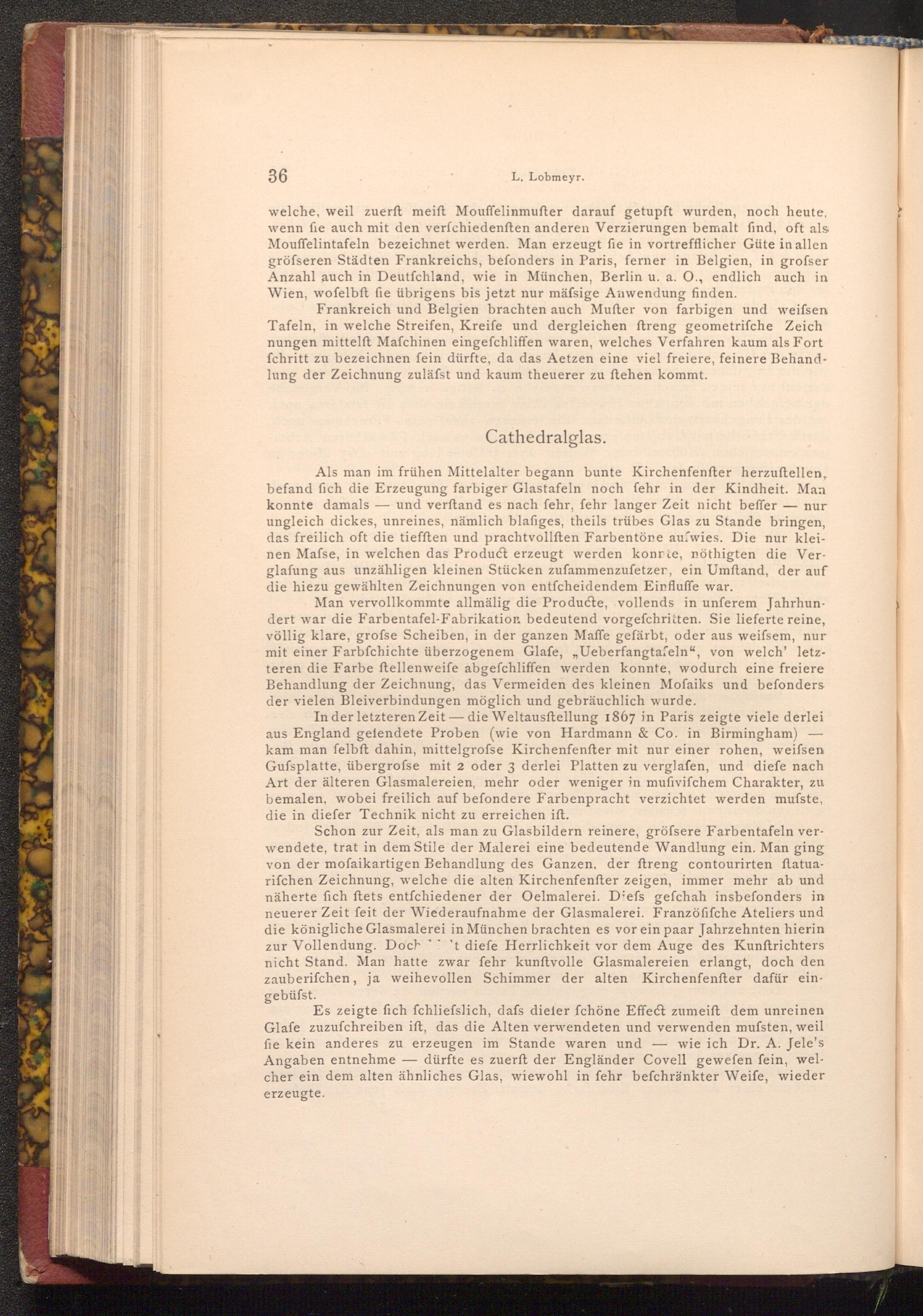 Es zeigte fich fchliefslich, dafs dieter fchöne Effect zumeift dem unreinen Glafe zuzufchreiben ift, das die Alten verwendeten und verwenden mufsten, weil fie kein anderes zu erzeugen im Stande waren und wie ich Dr. A. Jele's Angaben entnehme- dürfte es zuerft der Engländer Covell gewefen fein, welcher ein dem alten ähnliches Glas, wiewohl in fehr befchränkter Weife, wieder erzeugte.