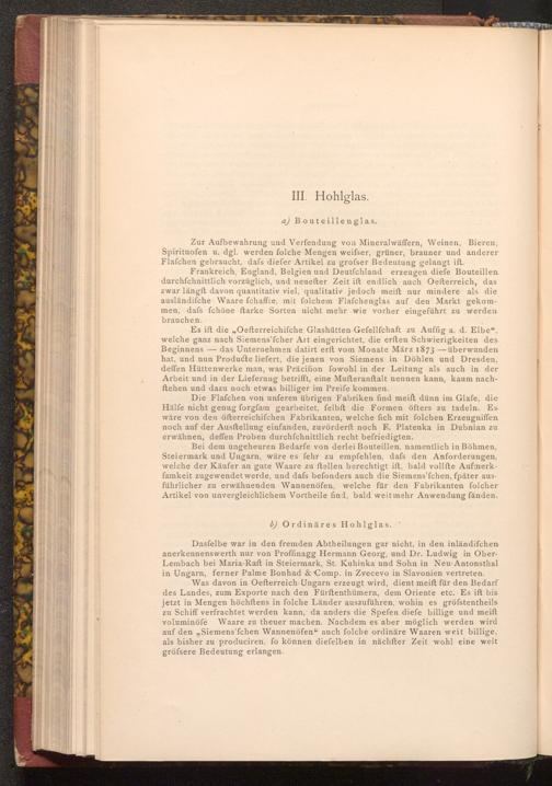 Was davon in Oefterreich Ungarn erzeugt wird, dient meift für den Bedarf des Landes, zum Exporte nach den Fürftenthümern, dem Oriente etc. Es ist bis jetzt in Mengen höchftens in folche Länder auszuführen, wohin es gröfstentheils zu Schiff verfrachtet werden kann, da anders die Spefen diefe billige und meift voluminöfe Waare zu theuer machen. Nachdem es aber möglich werden wird auf den„ Siemens'fchen Wannenöfen" auch folche ordinäre Waaren weit billige, als bisher zu produciren, fo können diefelben in nächfter Zeit wohl eine weit gröfsere Bedeutung erlangen.