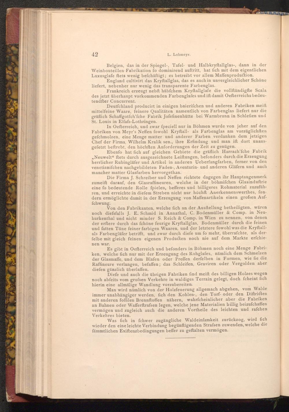In Oefterreich, und zwar fpeciell nur in Böhmen wurde von jeher auf den Fabriken von Meyr's Neffen fowohl Kryftall- als Farbenglas am vorzüglichften gefchmolzen, eine Menge matter und anderer Farben verdanken dem jetzigen Chef der Firma, Wilhelm Kralik sen., ihre Erfindung und man ift dort unausgefetzt beftrebt, den höchften Anforderungen der Zeit zu genügen.