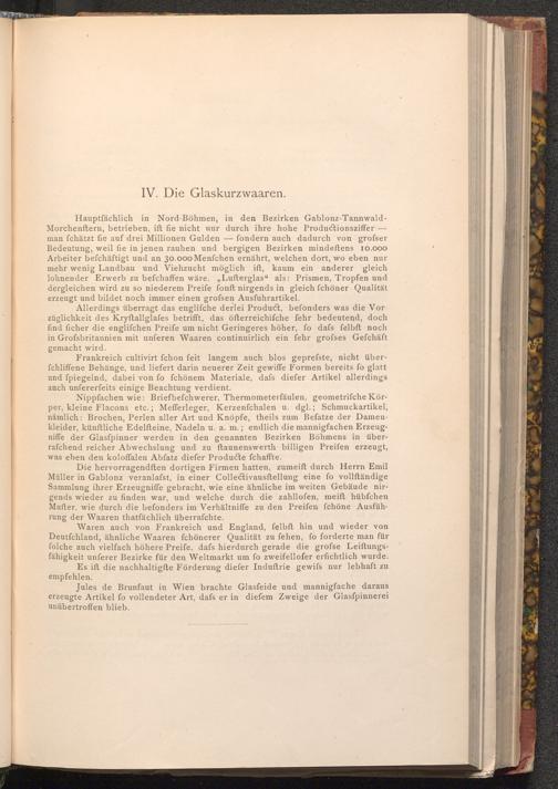 Hauptfächlich in Nord- Böhmen, in den Bezirken Gablonz- TannwaldMorchenftern, betrieben, ift fie nicht uur durch ihre hohe Productionsziffer- man fchätzt fie auf drei Millionen Gulden- fondern auch dadurch von grofser Bedeutung, weil fie in jenen rauhen und bergigen Bezirken mindeſtens 10.000 Arbeiter befchäftigt und an 30.000 Menfchen ernährt, welchen dort, wo eben nur mehr wenig Landbau und Viehzucht möglich ift, kaum ein anderer gleich lohnender Erwerb zu befchaffen wäre." Lufterglas" als: Prismen, Tropfen und dergleichen wird zu so niederem Preife fonft nirgends in gleich fchöner Qualität erzeugt und bildet noch immer einen grofsen Ausfuhrartikel.