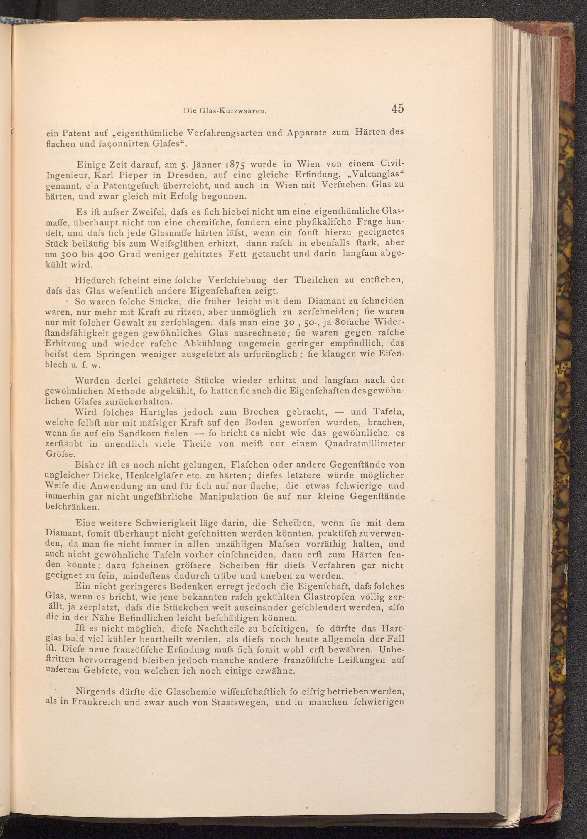 Einige Zeit darauf, am 5. Jänner 1875 wurde in Wien von einem CivilIngenieur, Karl Pieper in Dresden, auf eine gleiche Erfindung,„ Vulcanglas" genannt, ein Patentgefuch überreicht, und auch in Wien mit Verfuchen, Glas zu härten, und zwar gleich mit Erfolg begonnen.
