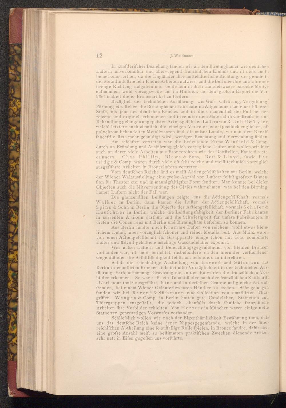 Bezüglich der techniſchen Ausführung, wie Gufs, Cifelirung, Vergoldung, Färbung etc. ftehen die Birminghamer Fabricate im Allgemeinen auf einer höheren Stufe, als jene des deutfchen Reiches und ift diefs namentlich der Fall bei den reizend und originell erfundenen und in reinfter dem Material in Conftruction und Behandlung gelungen angepafster Art ausgeführten Luftern von Ratcliff& Tyler, welch' letztere auch ziemlich die einzigen Vertreter jener fpecififch englichen, oft polychrom behandelten Metallwaaren find, die aufser Lande, wo nun dem Renaiffanceftile ftets mehr gehuldigt wird, weniger Beachtung und Verwendung finden. Am reichften vertreten war die bedeutende Firma Winfield& Comp. durch an Erfindung und Ausführung gleich vorzügliche Lufter und wollen wir hier auch an deren viele Arbeiten aus Bronceröhren wie der Bettftellen, Fauteuils etc. erinnern. Chas Phillip, Blews& Sons, Beft& Lloyd, fowie Partridge& Comp. waren durch viele oft fehr reiche und meift techniſch vorzüglich ausgeführte Arbeiten in Bronceluftern vertreten.