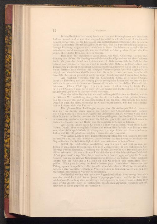Die glänzendften Leiftungen zeigte uns die Actiengeſellſchaft, vormals Walker in Berlin, dann kamen die Lufter der Actiengefellfchaft, vormals Spinn& Sohn in Berlin, die Objecte der Actiengeſellſchaft, vormals Schäfer& Haufchner in Berlin, welche die Leiftungsfähigkeit der Berliner Fabrikanten in currenten Artikeln darthun und die Schwierigkeit für unfere Fabrikanten, in diefen die Concurrenz mit Berlin und Birmingham beftehen zu können.
