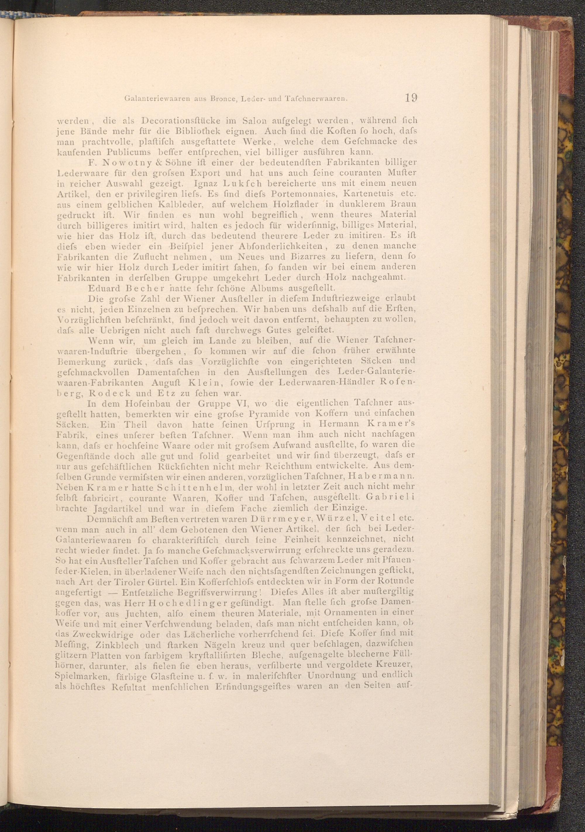 F. Nowotny& Söhne ift einer der bedeutendften Fabrikanten billiger Lederwaare für den grofsen Export und hat uns auch feine couranten Mufter in reicher Auswahl gezeigt. Ignaz Lukfch bereicherte uns mit einem neuen Artikel, den er privilegiren liefs. Es find diefs Portemonnaies, Kartenetuis etc. aus einem gelblichen Kalbleder, auf welchem Holzflader in dunklerem Braun gedruckt ift. Wir finden es nun wohl begreiflich, wenn theures Material durch billigeres imitirt wird, halten es jedoch für widerfinnig, billiges Material, wie hier das Holz ift, durch das bedeutend theurere Leder zu imitiren. Es ift diefs eben wieder ein Beispiel jener Abfonderlichkeiten, zu denen manche Fabrikanten die Zuflucht nehmen, um Neues und Bizarres zu liefern, denn fo wie wir hier Holz durch Leder imitirt fahen, fo fanden wir bei einem anderen Fabrikanten in derfelben Gruppe umgekehrt Leder durch Holz nachgeahmt. Eduard Becher hatte fehr fchöne Albums ausgeftellt.