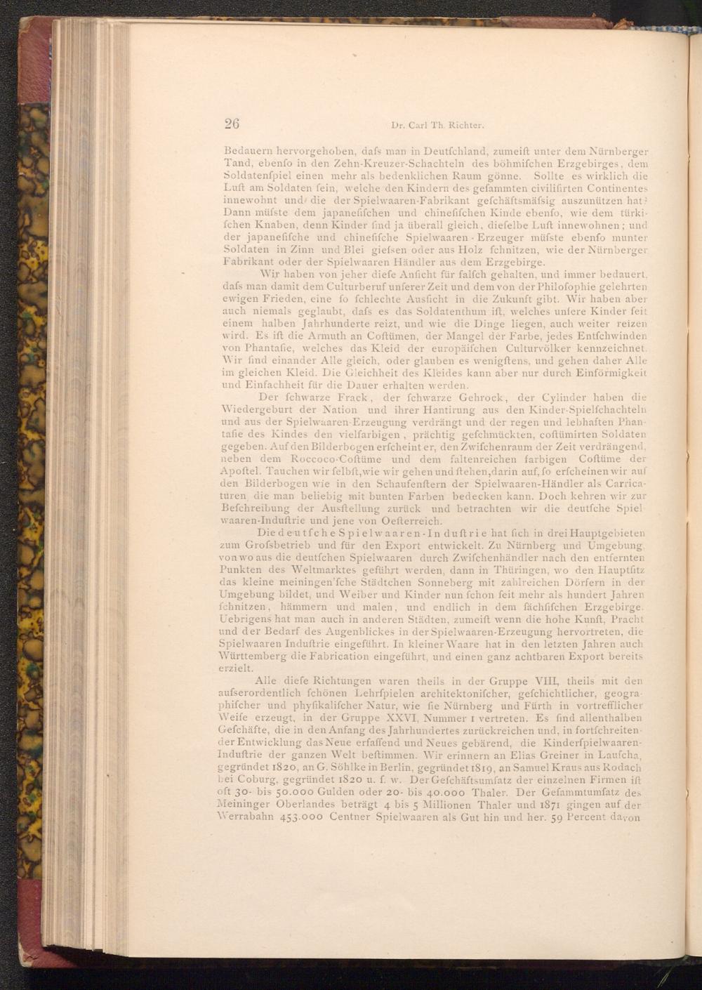 Alle diefe Richtungen waren theils in der Gruppe VIII, theils mit den aufserordentlich fchönen Lehrfpielen architektonifcher, gefchichtlicher, geographifcher und phyfikalifcher Natur, wie fie Nürnberg und Fürth in vortrefflicher Weife erzeugt, in der Gruppe XXVI, Nummer I vertreten. Es find allenthalben Gefchäfte, die in den Anfang des Jahrhundertes zurückreichen und, in fortfchreitender Entwicklung das Neue erfaffend und Neues gebärend, die KinderfpielwaarenInduftrie der ganzen Welt beftimmen. Wir erinnern an Elias Greiner in Laufcha, gegründet 1820, an G. Söhlke in Berlin, gegründet 1819, an Samuel Kraus aus Rodach bei Coburg, gegründet 1820 u. f. w. Der Gefchäftsumfatz der einzelnen Firmen iſt oft 30- bis 50.000 Gulden oder 20- bis 40.000 Thaler. Der Gefammtumfatz des Meininger Oberlandes beträgt 4 bis 5 Millionen Thaler und 1871 gingen auf der Werrabahn 453.000 Centner Spielwaaren als Gut hin und her. 59 Percent davon