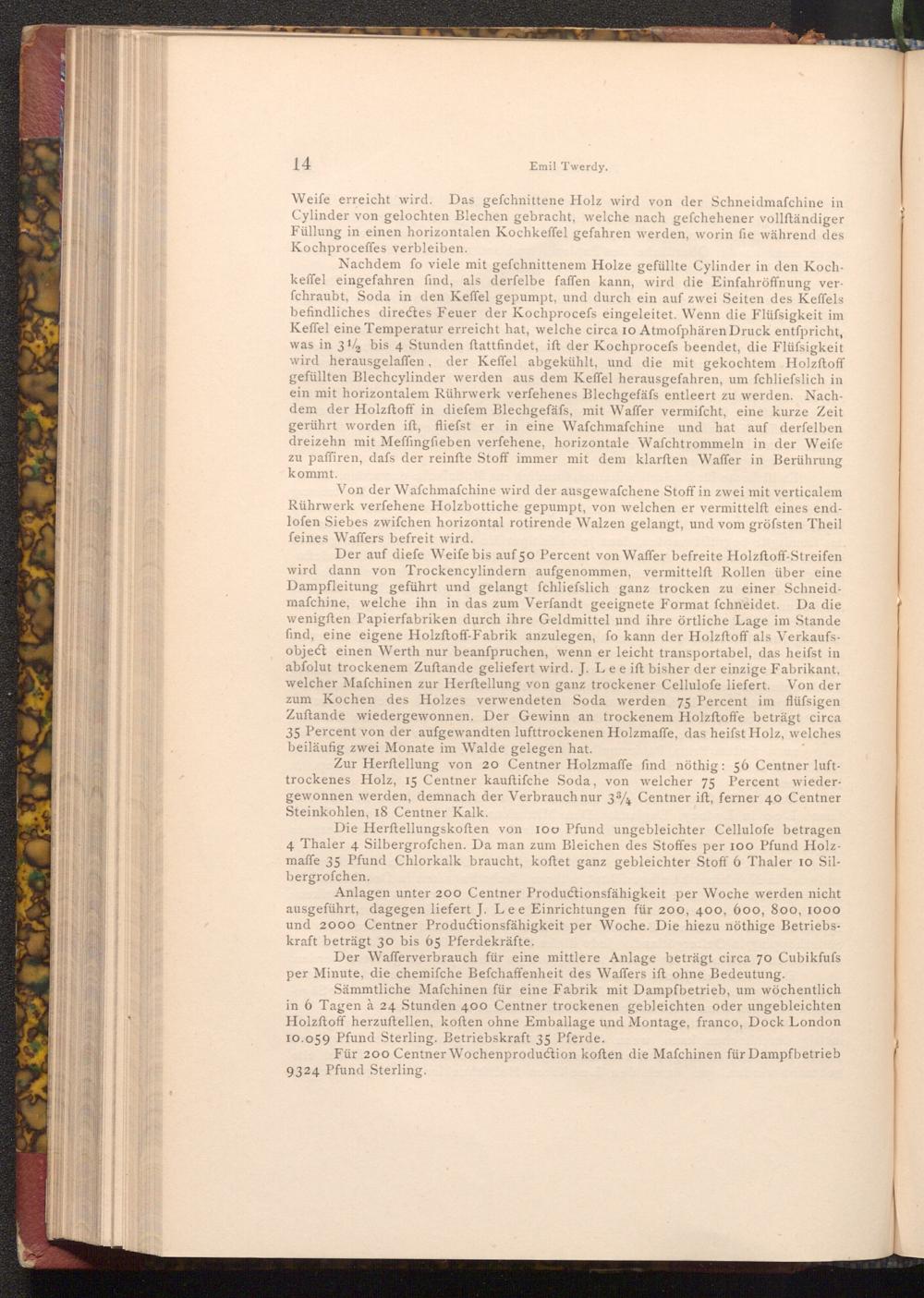 Sämmtliche Mafchinen für eine Fabrik mit Dampfbetrieb, um wöchentlich in 6 Tagen à 24 Stunden 400 Centner trockenen gebleichten oder ungebleichten Holzftoff herzuftellen, koften ohne Emballage und Montage, franco, Dock London 10.059 Pfund Sterling. Betriebskraft 35 Pferde.