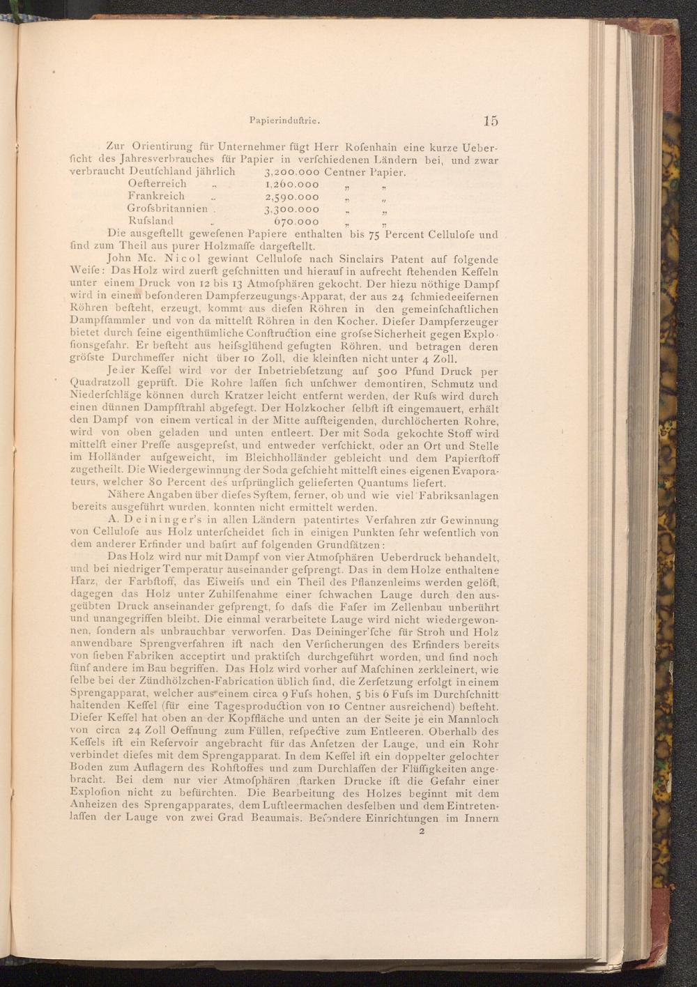 A. Deininger's in allen Ländern patentirtes Verfahren zur Gewinnung von Cellulofe aus Holz unterfcheidet fich in einigen Punkten fehr wefentlich von dem anderer Erfinder und bafirt auf folgenden Grundfätzen: