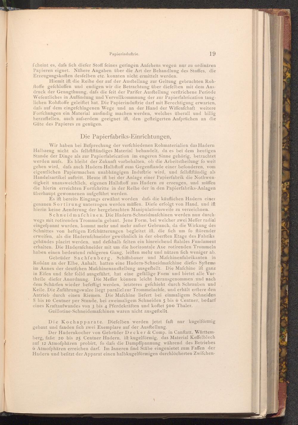 Hiemit ift die Reihe der auf der Ausftellung zur Geltung gebrachten Rohftoffe gefchloffen und endigen wir die Betrachtung über diefelben mit dem Ausdruck der Genugthuung, dafs die feit der Parifer Ausftellung verftrichene Periode Wefentliches in Auffindung und Vervollkommnung der zur Papierfabrication tauglichen Rohftoffe geleiftet hat. Die Papierinduftrie darf mit Berechtigung erwarten, dafs auf dem eingefchlagenen Wege und an der Hand der Wiffenfchaft weitere Forfchungen ein Material ausfindig machen werden, welches überall und billig herzuftellen, auch aufserdem geeignet ift, den gefteigerten Anfprüchen an die Güte des Papieres zu genügen.