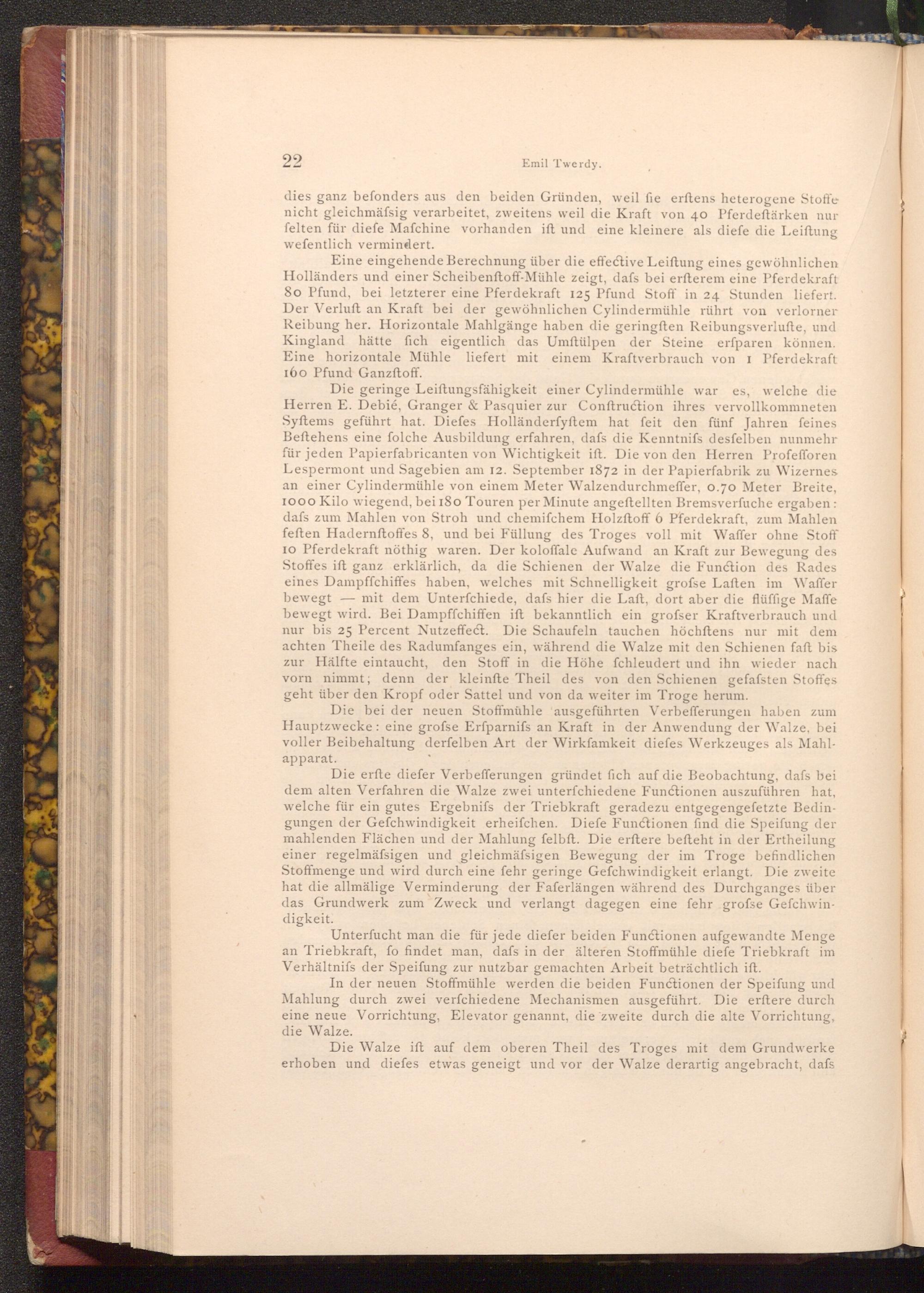 Die geringe Leiftungsfähigkeit einer Cylindermühle war es, welche die Herren E. Debié, Granger& Pasquier zur Conftruction ihres vervollkommneten Syftems geführt hat. Diefes Holländerfyftem hat feit den fünf Jahren feines Beftehens eine folche Ausbildung erfahren, dafs die Kenntnifs desfelben nunmehr für jeden Papierfabricanten von Wichtigkeit ift. Die von den Herren Profefforen Lespermont und Sagebien am 12. September 1872 in der Papierfabrik zu Wizernes an einer Cylindermühle von einem Meter Walzendurchmeffer, 0.70 Meter Breite, 1000 Kilo wiegend, bei 180 Touren per Minute angeftellten Bremsverfuche ergaben: dafs zum Mahlen von Stroh und chemifchem Holzftoff 6 Pferdekraft, zum Mahlen feften Hadernftoffes 8, und bei Füllung des Troges voll mit Waffer ohne Stoff 10 Pferdekraft nöthig waren. Der koloffale Aufwand an Kraft zur Bewegung des Stoffes ift ganz erklärlich, da die Schienen der Walze die Function des Rades eines Dampffchiffes haben, welches mit Schnelligkeit grofse Laften im Waffer bewegt mit dem Unterfchiede, dafs hier die Laft, dort aber die flüffige Maffe bewegt wird. Bei Dampffchiffen ift bekanntlich ein grofser Kraftverbrauch und nur bis 25 Percent Nutzeffect. Die Schaufeln tauchen höchftens nur mit dem achten Theile des Radumfanges ein, während die Walze mit den Schienen faft bis zur Hälfte eintaucht, den Stoff in die Höhe fchleudert und ihn wieder nach vorn nimmt; denn der kleinfte Theil des von den Schienen gefafsten Stoffes geht über den Kropf oder Sattel und von da weiter im Troge herum.
