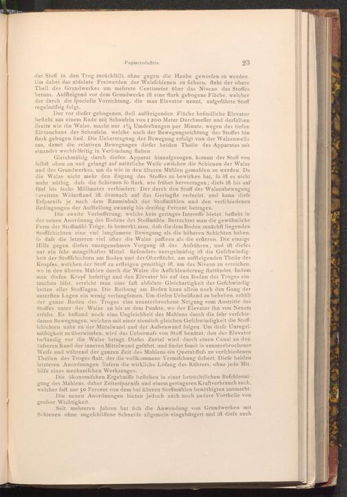 Die ökonomifchen Ergebniffe beftehen in einer beträchtlichen Befchleunigung des Mahlens, daher Zeiterfparnifs und einem geringeren Kraftverbrauch auch, welcher faft nur 50 Percent von dem bei älteren Stoffmühlen benöthigten ausmacht. Die neuen Anordnungen bieten jedoch auch noch andere Vortheile von grofser Wichtigkeit.