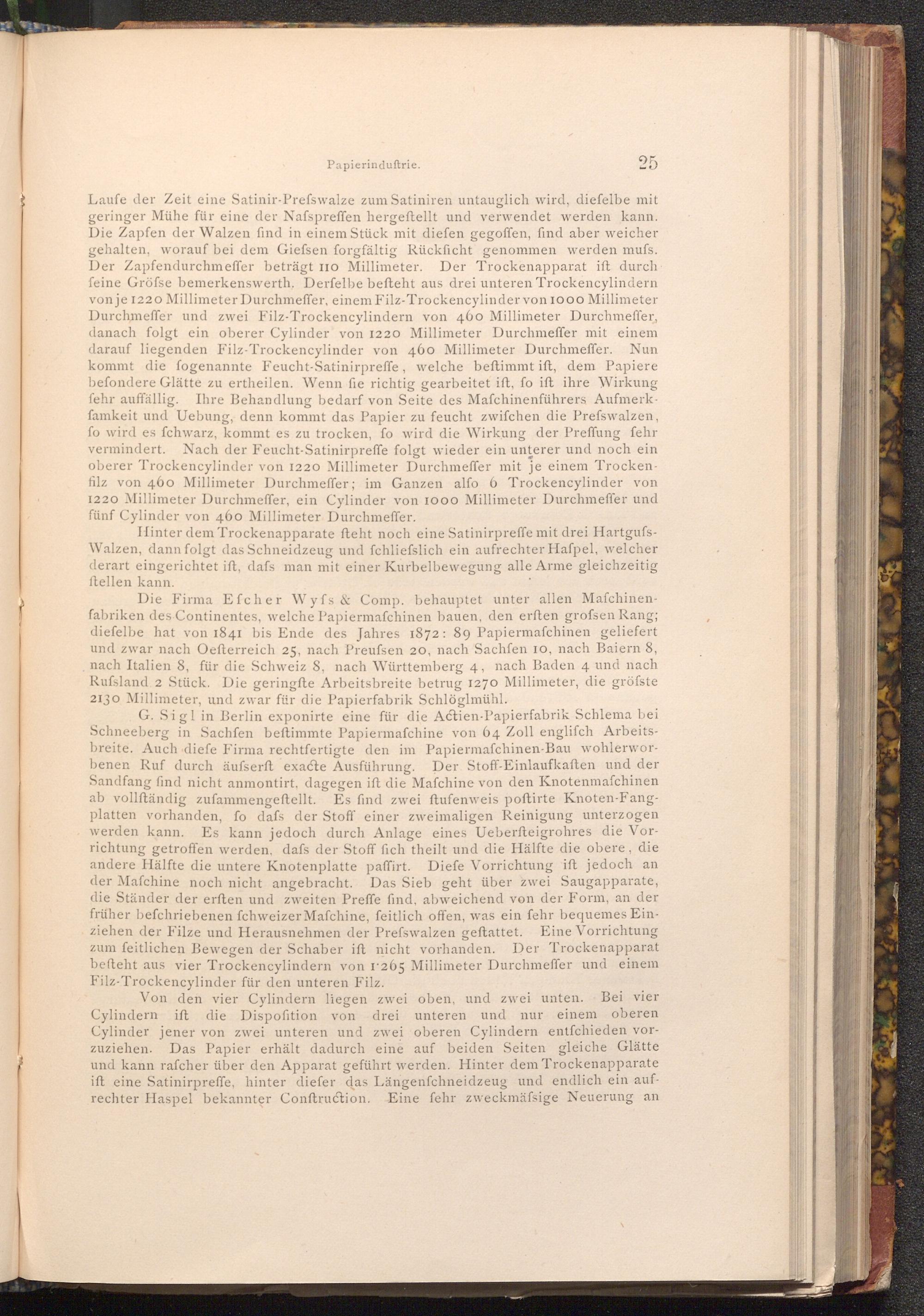 Laufe der Zeit eine Satinir- Prefswalze zum Satiniren untauglich wird, diefelbe mit geringer Mühe für eine der Nafspreffen hergeftellt und verwendet werden kann. Die Zapfen der Walzen find in einem Stück mit diefen gegoffen, find aber weicher gehalten, worauf bei dem Giefsen forgfältig Rückficht genommen werden muss. Der Zapfendurchmeffer beträgt 110 Millimeter. Der Trockenapparat ift durch feine Gröfse bemerkenswerth, Derfelbe befteht aus drei unteren Trockencylindern von je 1220 Millimeter Durchmeffer, einem Filz- Trockencylinder von 1000 Millimeter Durchmeffer und zwei Filz- Trockencylindern von 460 Millimeter Durchmeffer, danach folgt ein oberer Cylinder von 1220 Millimeter Durchmeffer mit einem darauf liegenden Filz- Trocken cylinder von 460 Millimeter Durchmeffer. Nun kommt die fogenannte Feucht- Satinirpreffe, welche beftimmt ift, dem Papiere befondere Glätte zu ertheilen. Wenn fie richtig gearbeitet ift, fo ift ihre Wirkung fehr auffällig. Ihre Behandlung bedarf von Seite des Mafchinenführers Aufmerkfamkeit und Uebung, denn kommt das Papier zu feucht zwifchen die Prefswalzen, fo wird es fchwarz, kommt es zu trocken, fo wird die Wirkung der Preffung fehr vermindert. Nach der Feucht- Satinirpreffe folgt wieder ein unterer und noch ein oberer Trockencylinder von 1220 Millimeter Durchmeffer mit je einem Trockenfilz von 460 Millimeter Durchmeffer; im Ganzen alfo 6 Trockencylinder von 1220 Millimeter Durchmeffer, ein Cylinder von 1000 Millimeter Durchmeffer und fünf Cylinder von 460 Millimeter Durchmeffer.
