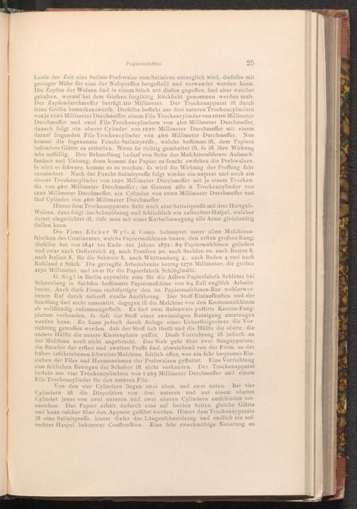 Die Firma Efcher Wyfs& Comp. behauptet unter allen Maſchinenfabriken des Continentes, welche Papiermafchinen bauen, den erften grofsen Rang; diefelbe hat von 1841 bis Ende des Jahres 1872: 89 Papiermafchinen geliefert und zwar nach Oefterreich 25, nach Preufsen 20, nach Sachfen 10, nach Baiern 8, nach Italien 8, für die Schweiz 8, nach Württemberg 4, nach Baden 4 und nach Rufsland 2 Stück. Die geringfte Arbeitsbreite betrug 1270 Millimeter, die gröfste 2130 Millimeter, und zwar für die Papierfabrik Schlöglmühl.