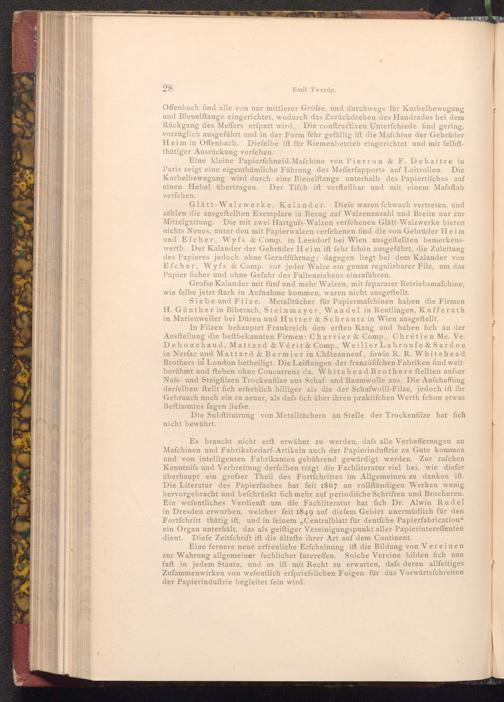 Eine fernere neue erfreuliche Erfcheinung ift die Bildung von Vereinen zur Wahrung allgemeiner fachlicher Intereffen. Solche Vereine bilden fich nun faft in jedem Staate, und es ift mit Recht zu erwarten, dafs deren allfeitiges Zufammenwirken von wefentlich erfpriefslichen Folgen für das Vorwärtsfchreiten der Papierinduftrie begleitet ſein wird.
