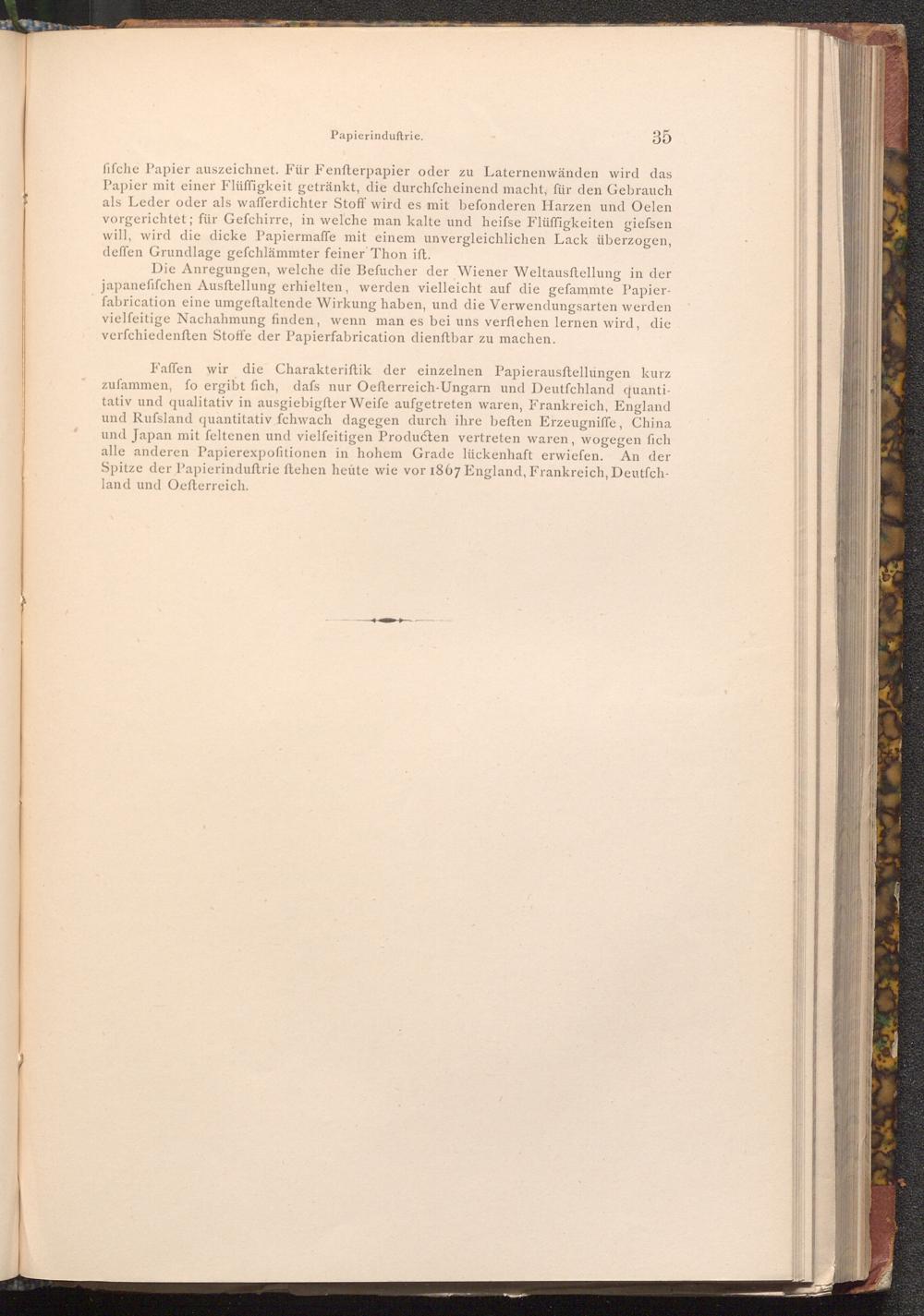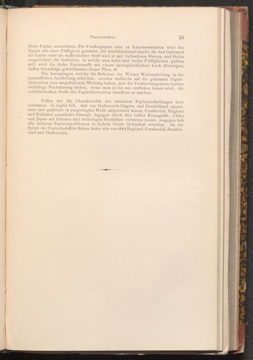Die Anregungen, welche die Befucher der Wiener Weltausftellung in der japanefifchen Ausftellung erhielten, werden vielleicht auf die gefammte Papierfabrication eine umgeftaltende Wirkung haben, und die Verwendungsarten werden vielfeitige Nachahmung finden, wenn man es bei uns verftehen lernen wird, die verfchiedenften Stoffe der Papierfabrication dienftbar zu machen.