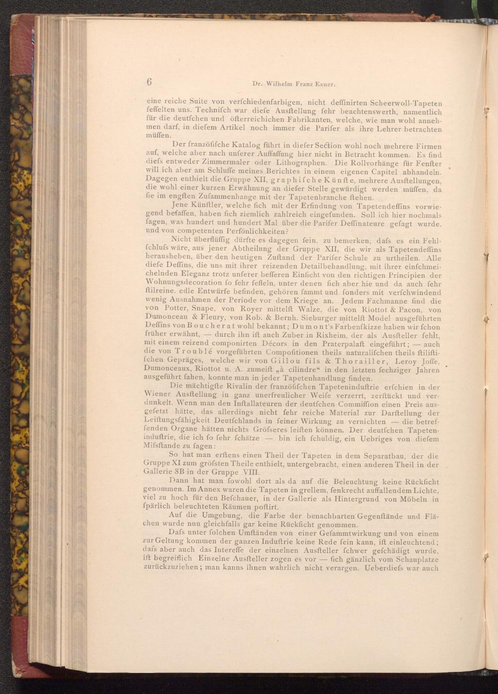 Der franzöfifche Katalog führt in diefer Section wohl noch mehrere Firmen auf, welche aber nach unferer Auffaffung hier nicht in Betracht kommen. Es find diefs entweder Zimmermaler oder Lithographen. Die Rollvorhänge für Fenster will ich aber am Schluffe meines Berichtes in einem eigenen Capitel abhandeln. Dagegen enthielt die Gruppe XII, graphifche Künfte, mehrere Ausftellungen, die wohl einer kurzen Erwähnung an diefer Stelle gewürdigt werden müffen, da fie im engften Zufammenhange mit der Tapetenbranche ftehen.