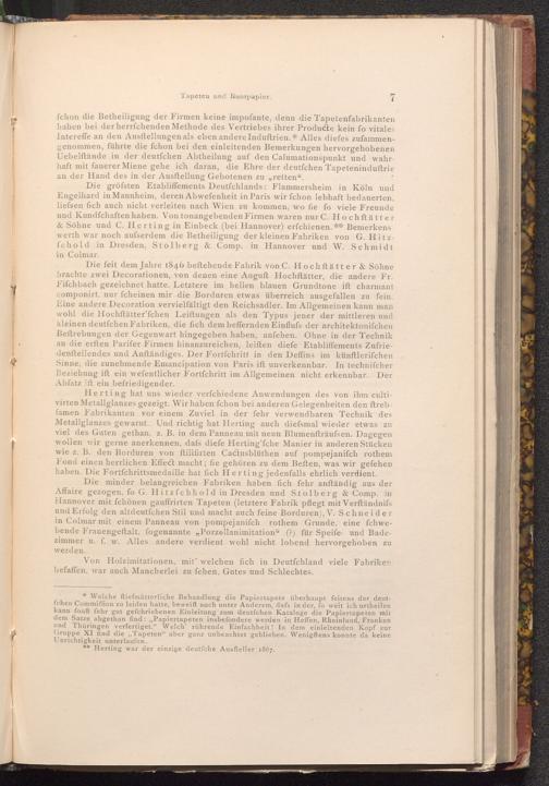 Die feit dem Jahre 1846 beftehende Fabrik von C. Hochftätter& Söhne brachte zwei Decorationen, von denen eine Auguft Hochftätter, die andere Fr. Fifchbach gezeichnet hatte. Letztere im hellen blauen Grundtone ift charmant componirt, nur fcheinen mir die Borduren etwas überreich ausgefallen zu fein. Eine andere Decoration vervielfältigt den Reichsadler. Im Allgemeinen kann man wohl die Hochftätter'fchen Leiftungen als den Typus jener der mittleren und kleinen deutfchen Fabriken, die fich dem beffernden Einfluss der architektonifchen Beftrebungen der Gegenwart hingegeben haben, anfehen. Ohne in der Technik an die erften Parifer Firmen hinanzureichen, leiften diefe Etabliffements Zufrie denftellendes und Anftändiges. Der Fortfchritt in den Deffins im künftlerifchen Sinne, die zunehmende Emancipation von Paris ift unverkennbar. In technifcher Beziehung ift ein wefentlicher Fortfchritt im Allgemeinen nicht erkennbar. Der Abfatz ift ein befriedigender.