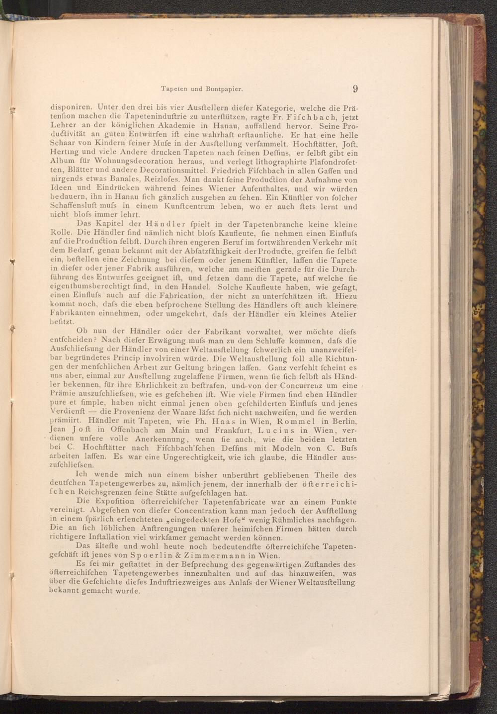 Ob nun der Händler oder der Fabrikant vorwaltet, wer möchte diefs entfcheiden? Nach diefer Erwägung mufs man zu dem Schluffe kommen, dafs die Ausfchliefsung der Händler von einer Weltausstellung fchwerlich ein unanzweifelbar begründetes Princip involviren würde. Die Weltausftellung foll alle Richtungen der menfchlichen Arbeit zur Geltung bringen laffen. Ganz verfehlt fcheint es uns aber, einmal zur Ausftellung zugelaffene Firmen, wenn fie fich felbft als Händler bekennen, für ihre Ehrlichkeit zu beftrafen, und von der Concurrenz um eine Prämie auszufchliefsen, wie es gefchehen ift. Wie viele Firmen find eben Händler pure et fimple, haben nicht einmal jenen oben gefchilderten Einfluss und jenes Verdienft die Provenienz der Waare läfst fich nicht nachweifen, und fie werden prämiirt. Händler mit Tapeten, wie Ph. Haas in Wien, Rommel in Berlin, Jean Jo ft in Offenbach am Main und Frankfurt, Lucius in Wien, verdienen unfere volle Anerkennung, wenn fie auch, wie die beiden letzten bei C. Hochftätter nach Fifchbach'fchen Deffins mit Modeln von C. Bufs arbeiten laffen. Es war eine Ungerechtigkeit, wie ich glaube, die Händler aus