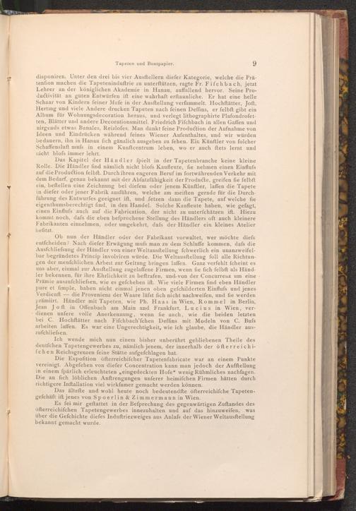 Es fei mir geftattet in der Befprechung des gegenwärtigen Zuftandes des öfterreichifchen Tapetengewerbes innezuhalten und auf das hinzuweifen, was über die Gefchichte diefes Induftriezweiges aus Anlafs der Wiener Weltausftellung bekannt gemacht wurde.