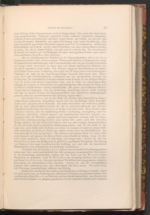 niäre Erfolg diefes Unternehmens noch in Frage ftand, fehr warm für diefe Richtung ausgefprochen. Sieburger exponirte ferner mehrere harmoniſch zufammengeftellte Zimmerdecorationen und zwar einen Salon, ein Schlaf-, ein Herren- und ein Speifezimmer, fämmtlich von guter Zeichnung und netter Ausführung. Die fonft ausgeftellt gewefenen Rouleaux zeigten natürlich die bekannten, rühmlichen Beftrebungen der Fabrik, welche eine Production von einer halben Million Rollen im Jahre, das ift zu einem Umfatz von 250.000 fl. erreicht hat. Die Arbeiterzahl ift fowohl bei Spörlin als bei Sieburger die einer mittelgrofsen Fabrik nach aufseröfterreichischen Begriffen( 200 Arbeiter).